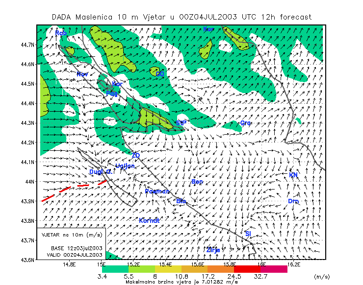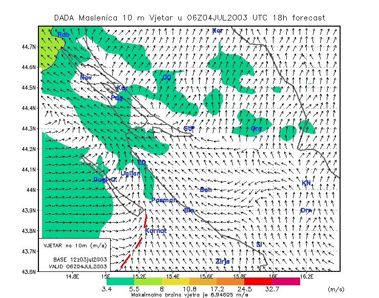 04 July 2003/00.00 UTC - ALADIN model forecasts (model run 03 July/12.00 UTC); arrows: 10 m wind, colour shades: isotachs, red: line of