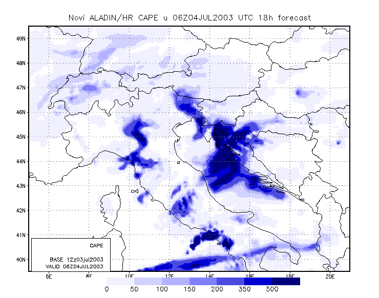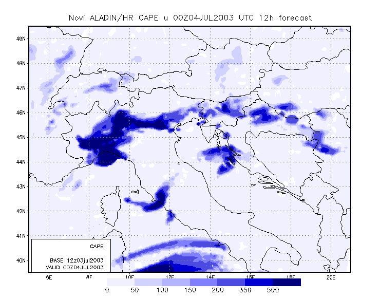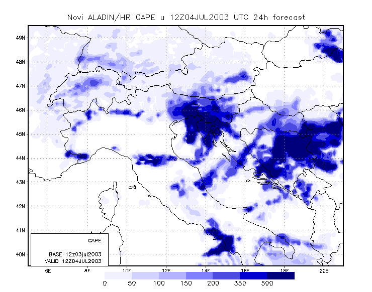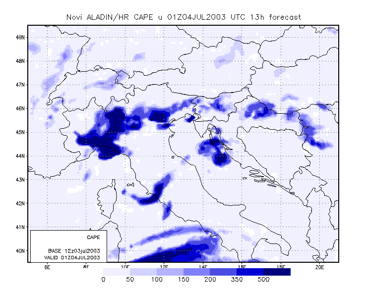 04 July 2003/00.00 - ALADIN model forecasts (model run 03 July/12.00 UTC); blue: Convective Available; 00.00 - 13.00 UTC hourly image