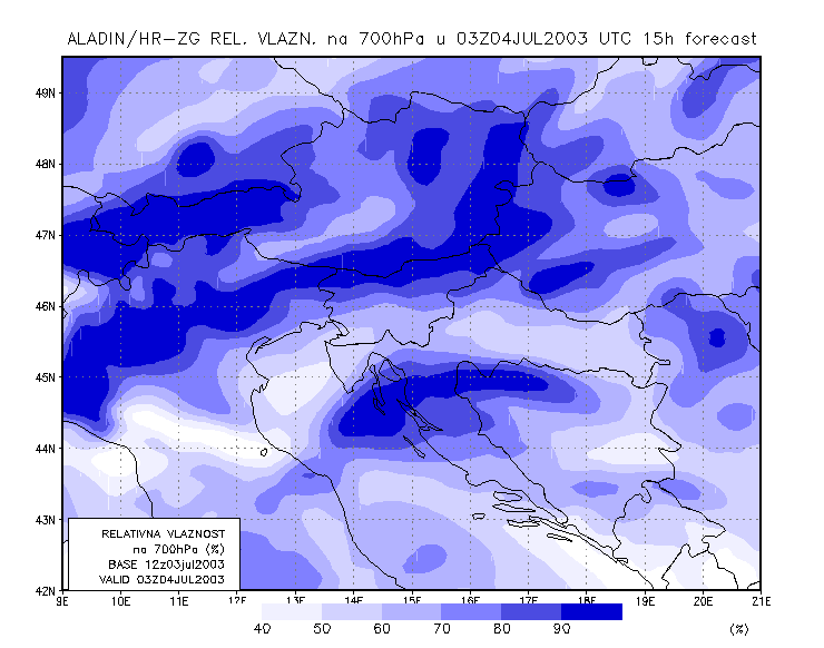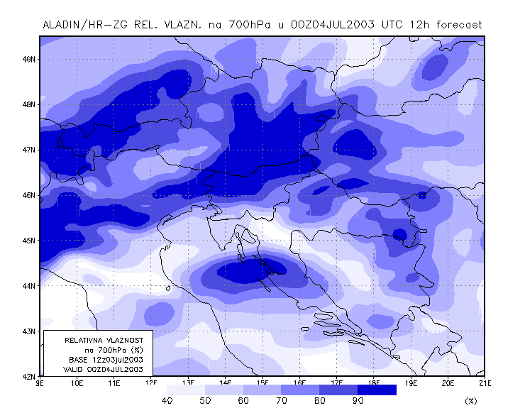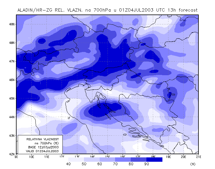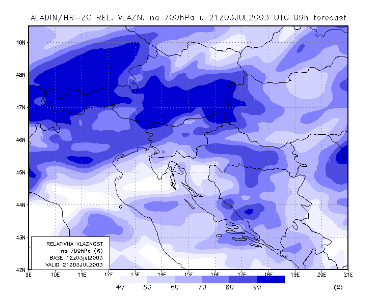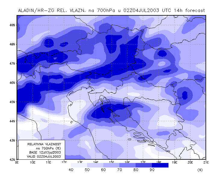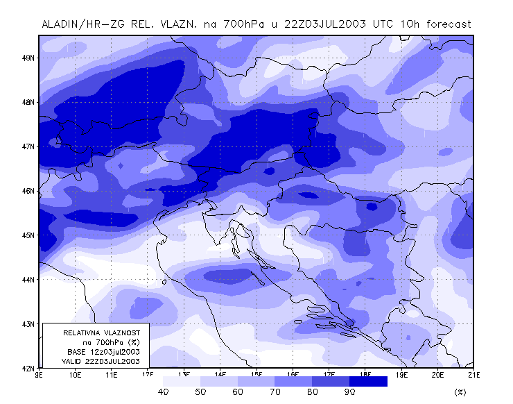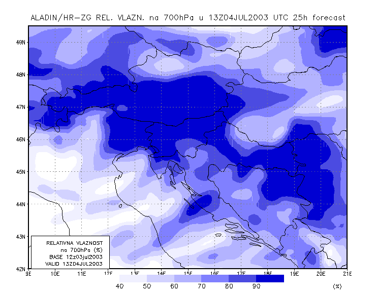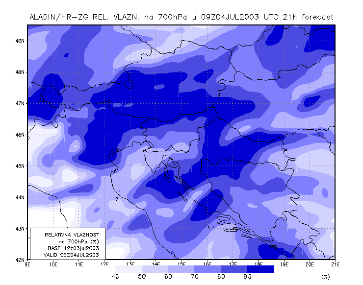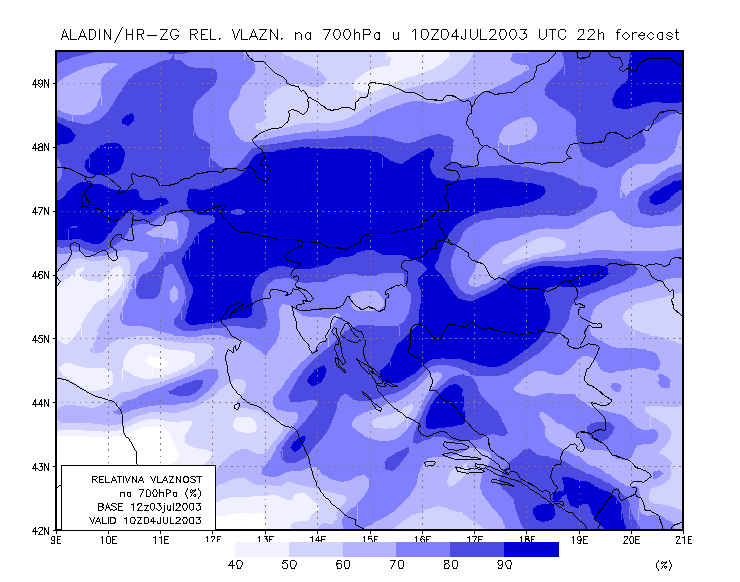 03 July 2003/21.00 UTC - ALADIN model forecasts (model run 03 July/12.00 UTC); blue: relative humidity at 700 hPa level (%); 03/21.00 -