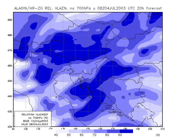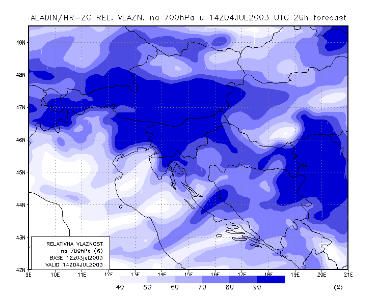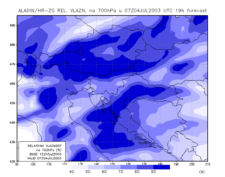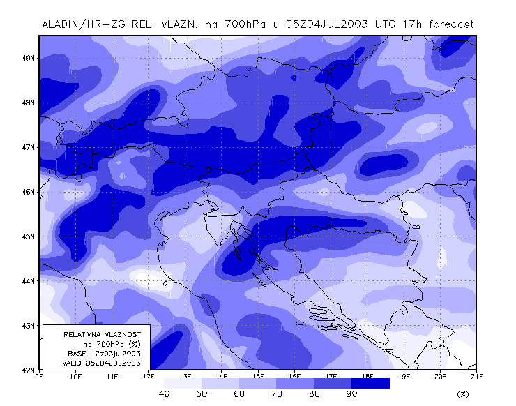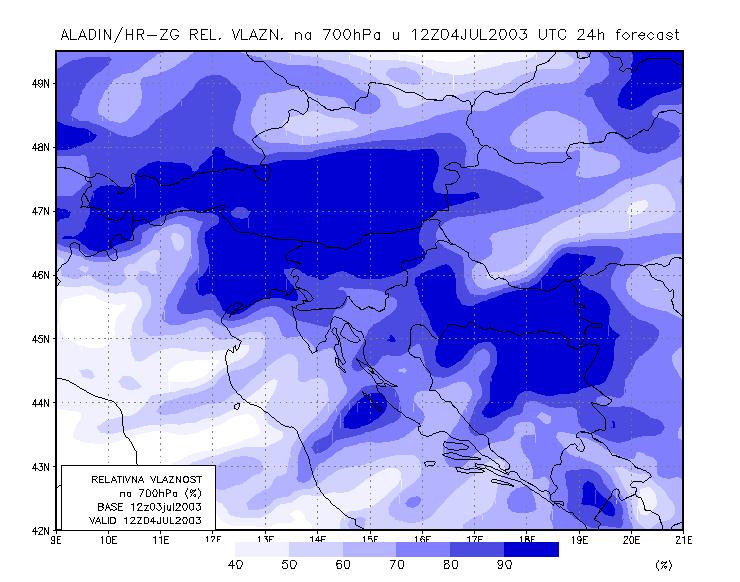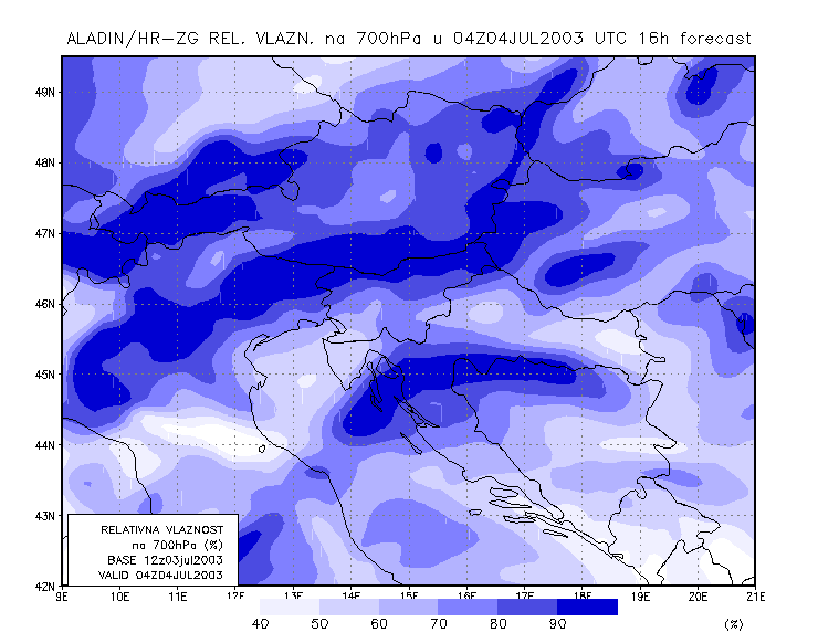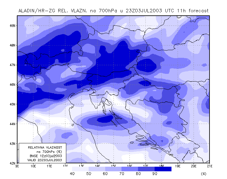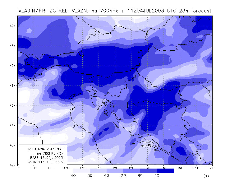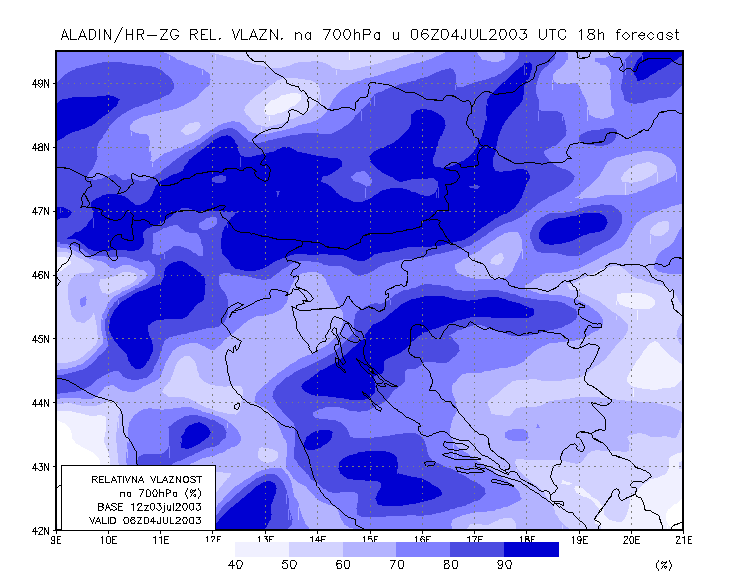 03 July 2003/21.00 UTC - ALADIN model forecasts (model run 03 July/12.00 UTC); blue: relative humidity at 700 hPa level (%); 03/21.00 -