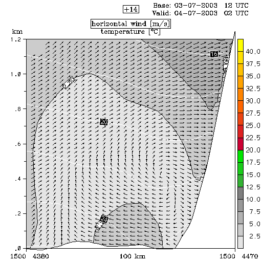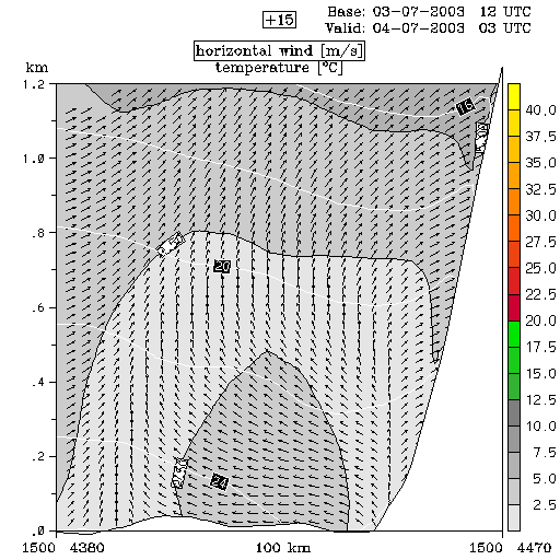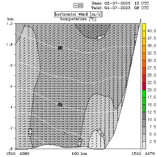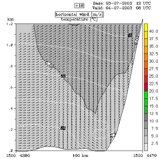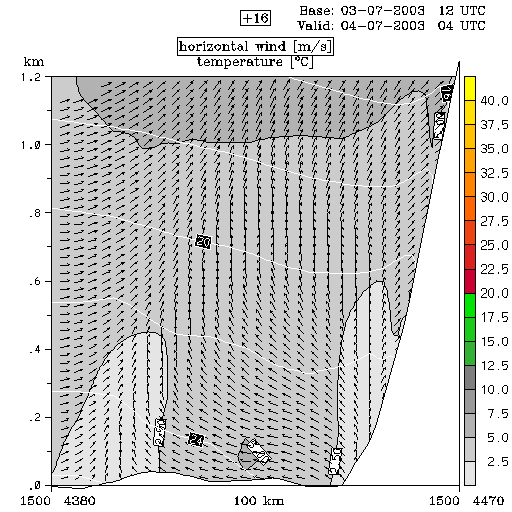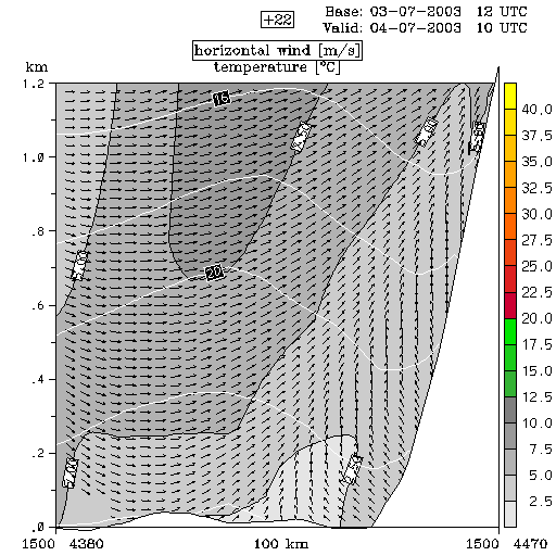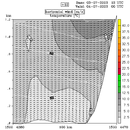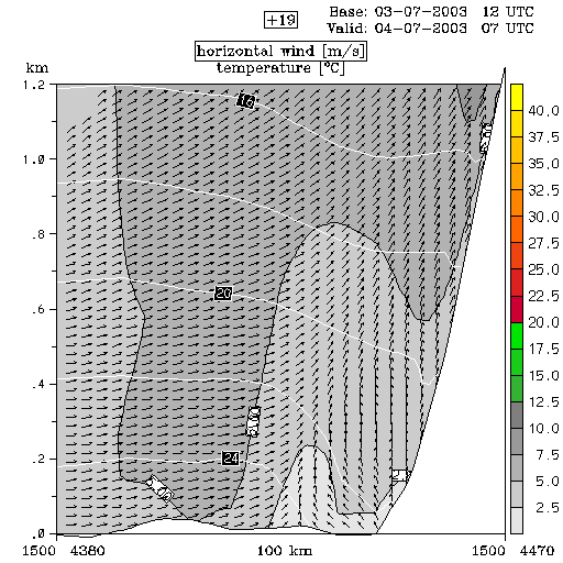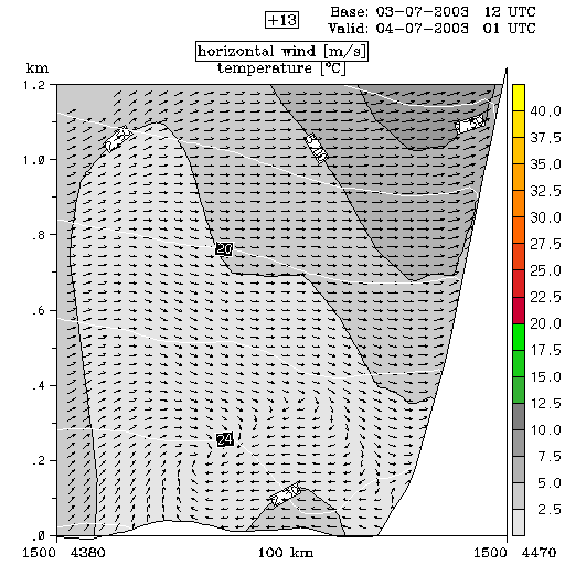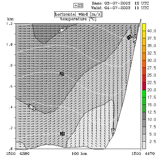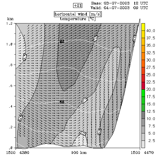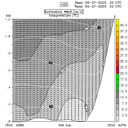 04 July 2003/00.00 UTC - ALADIN model forecasts (model run 03 July/12.00 UTC); white lines: temperature, arrows: horizontal wind, grey