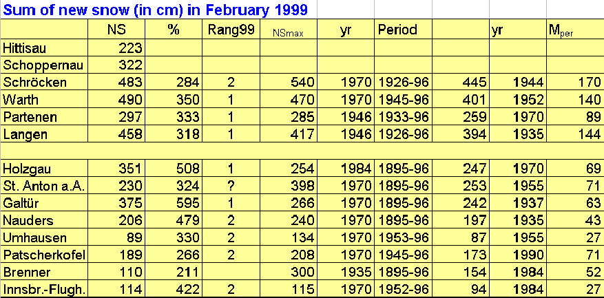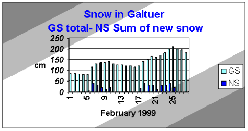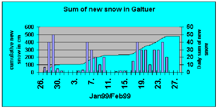 The graphics show the cumulative heights of new snow for Galtuer during February 1999 as well as the relationship between new and total snow. The periods with new snow correspond to the periods mentioned above. Cumulative heights of up to 400 cm are recorded. The table shows that these amounts are the highest observed during the last 100 years. The table shows, furthermore, that also for other villages in the Austrian Alpine area the snow heights were highest or the second highest since records began.