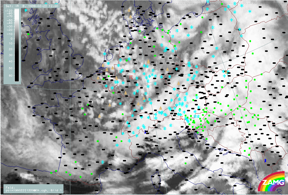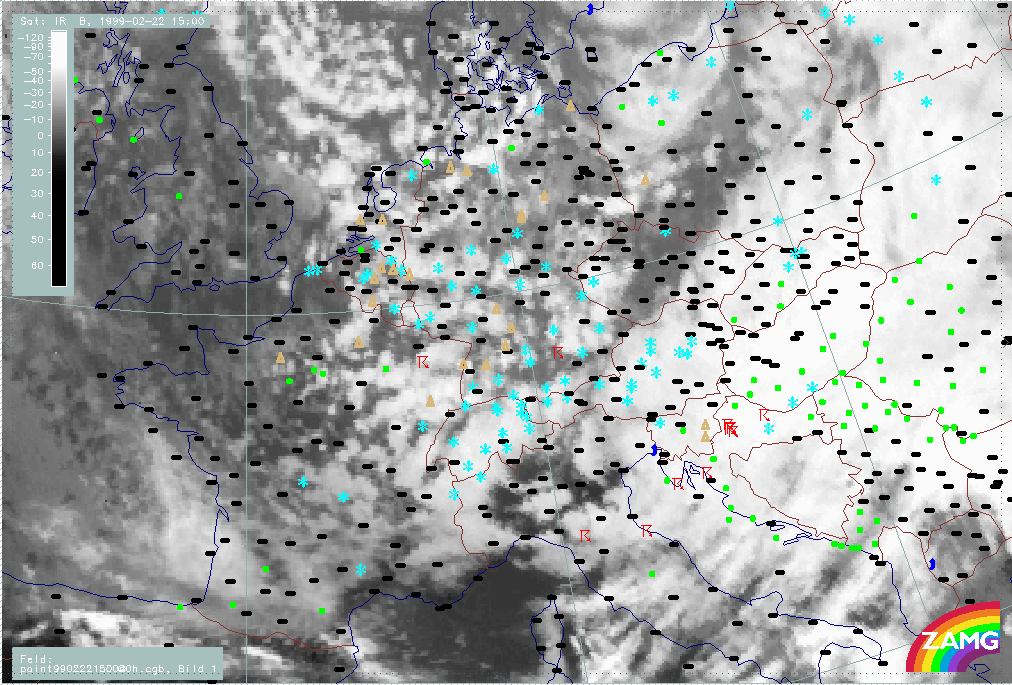 22 February 1999/15.00 UTC - Meteosat IR image; weather events (green: rain and showers, blue: drizzle, cyan: snow, red: thunderstorm with precipitation, purple: freezing rain, orange: