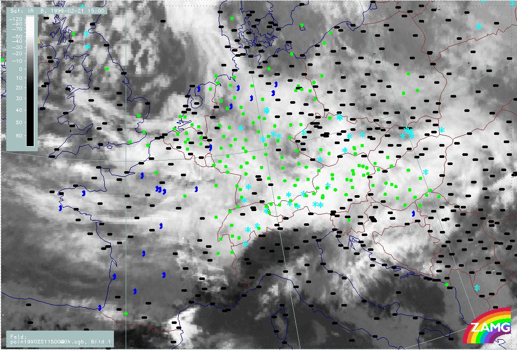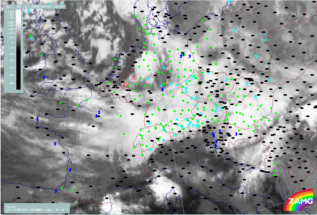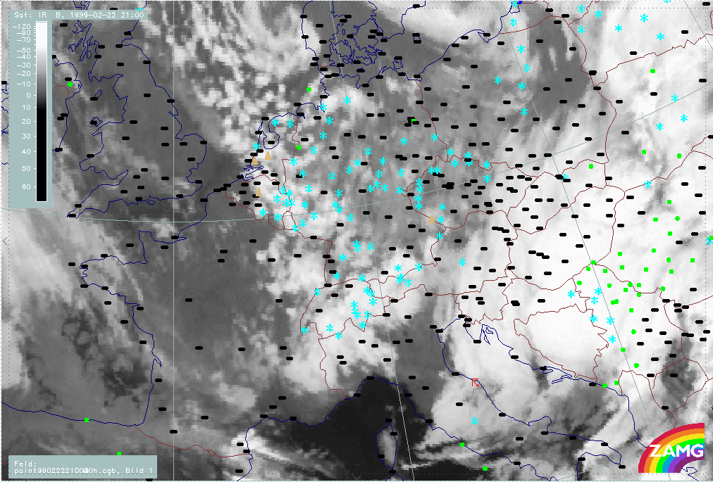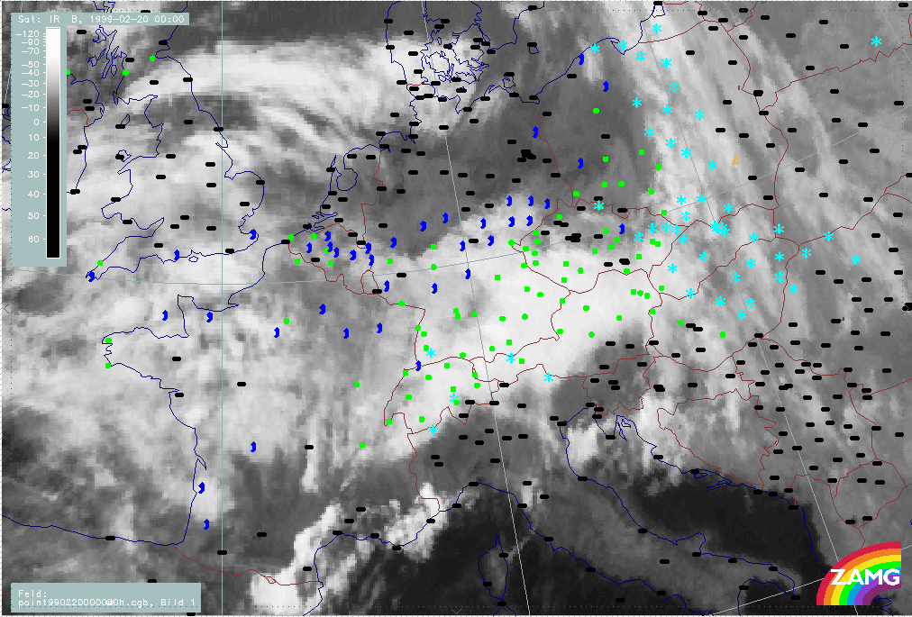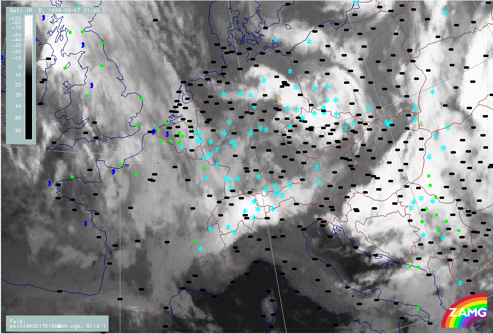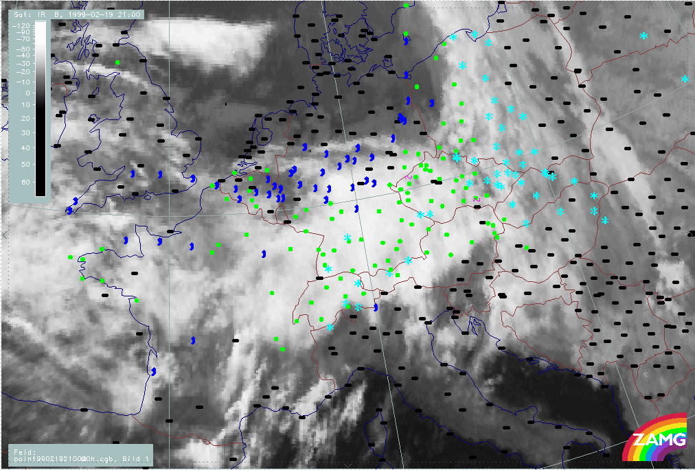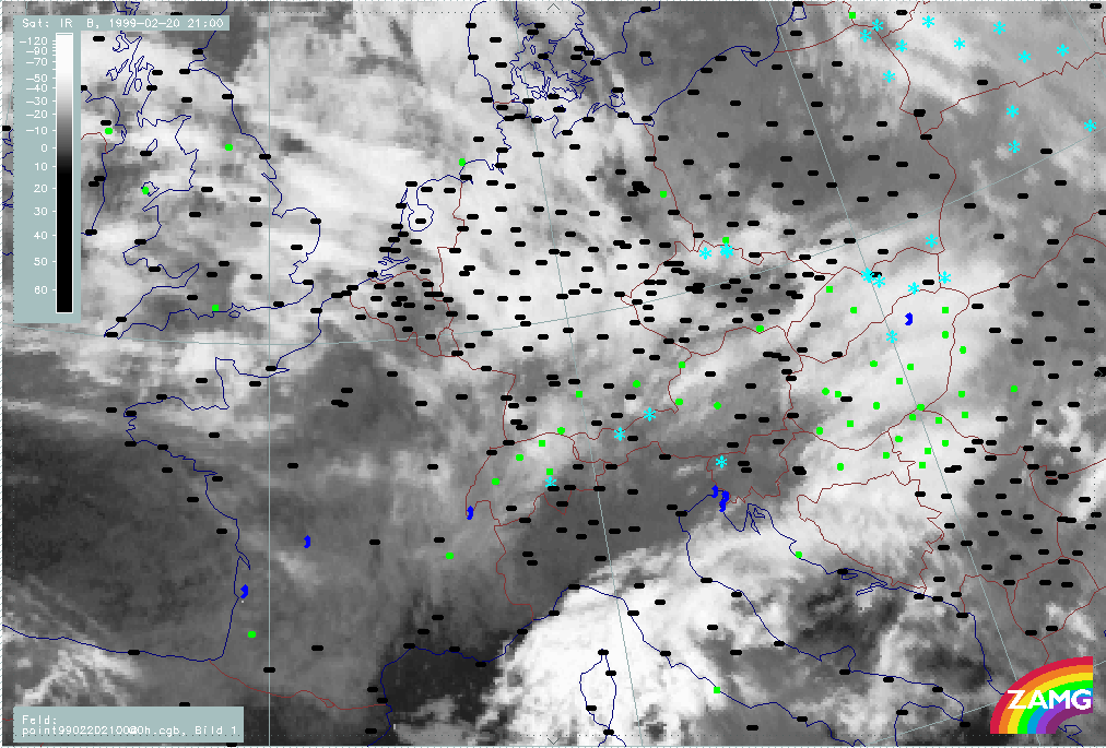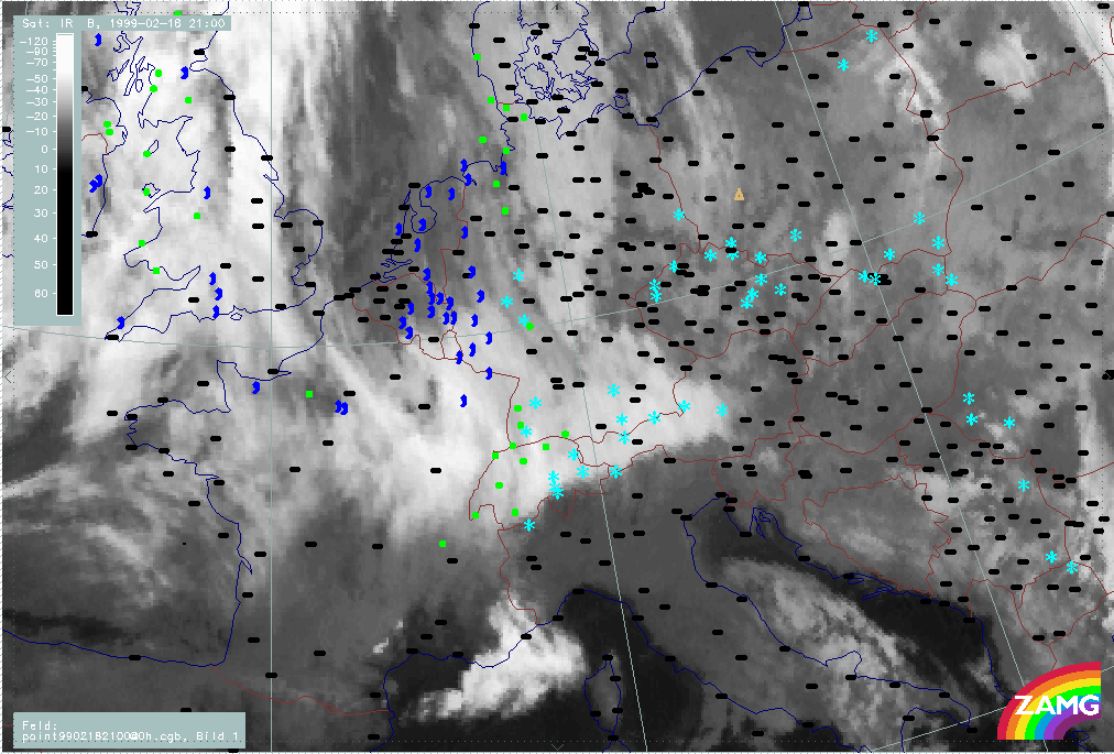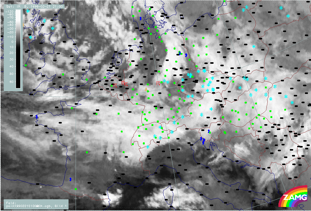 20 February 1999/21.00 UTC - Meteosat IR image; weather events (green: rain and showers, blue: drizzle, cyan: snow, red: thunderstorm with precipitation, purple: freezing rain, orange: