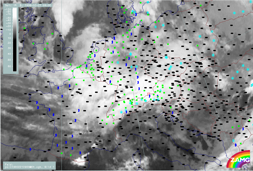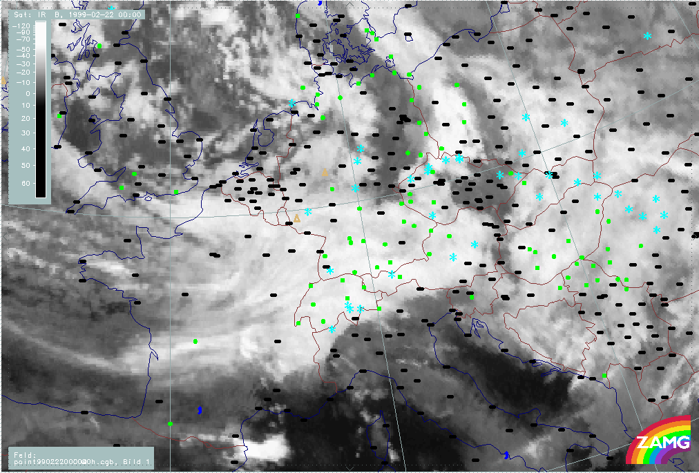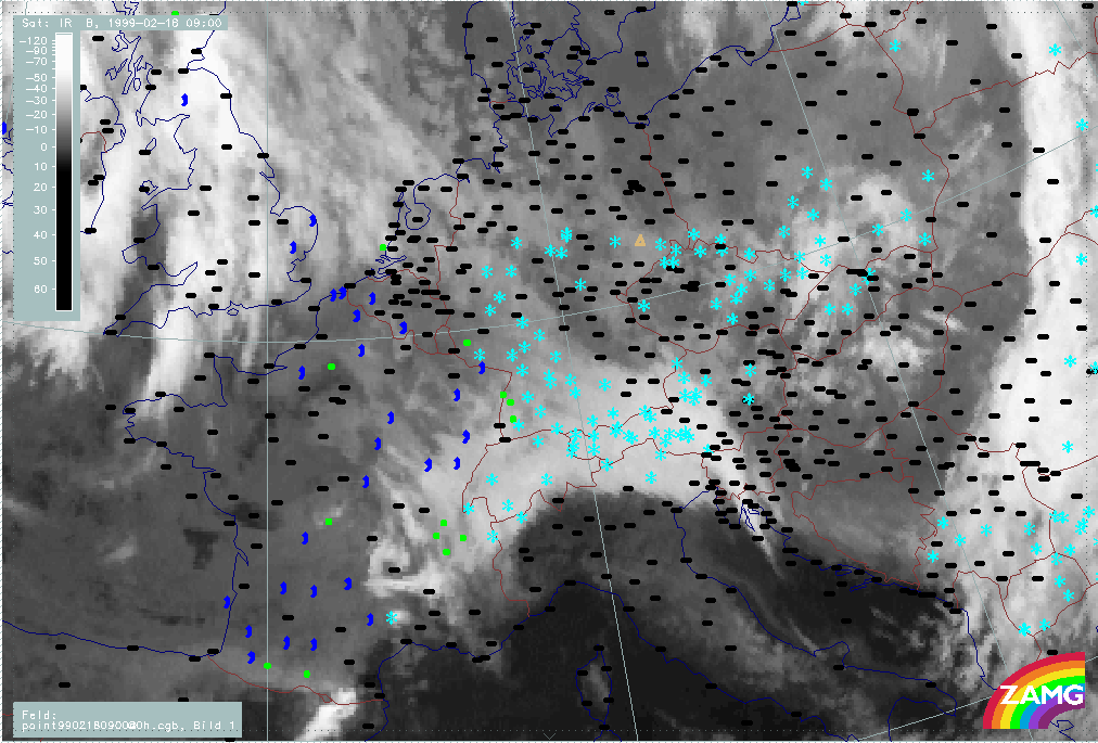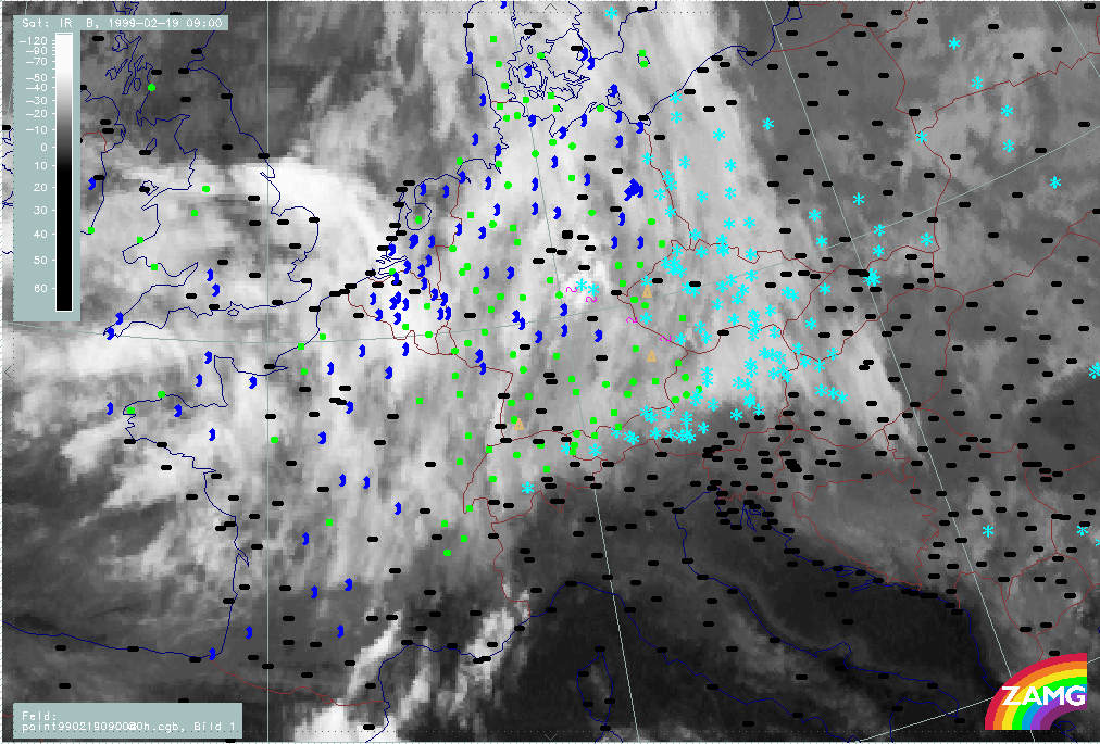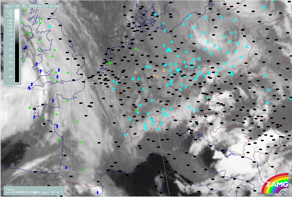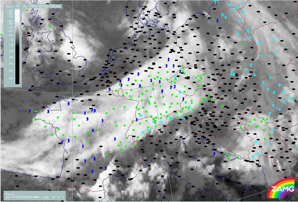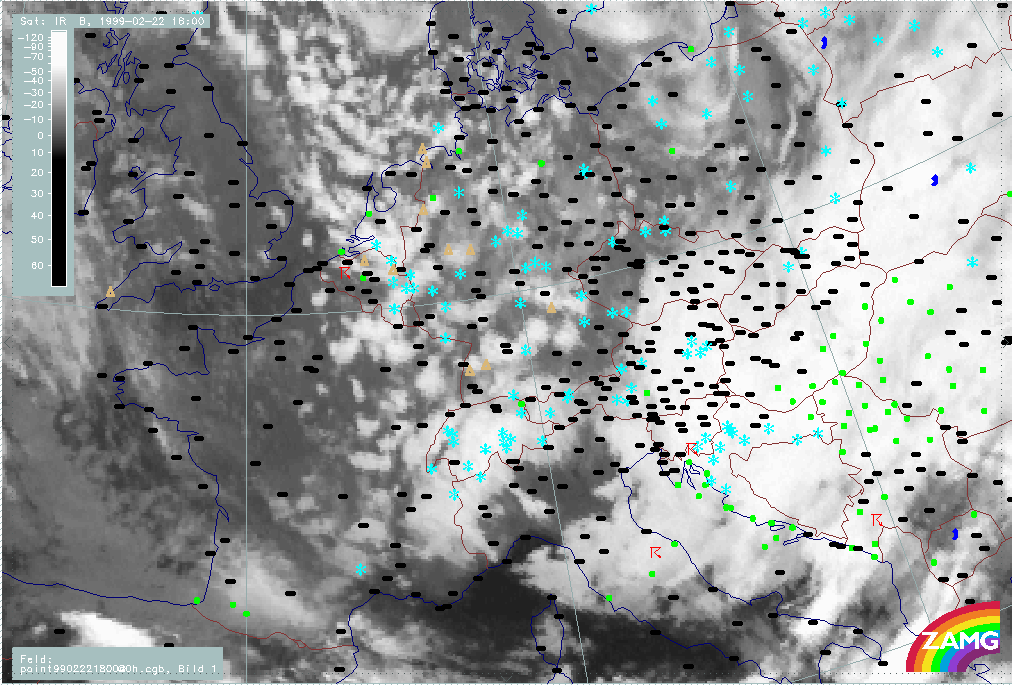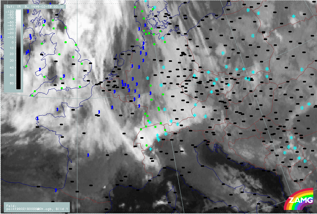 20 February 1999/21.00 UTC - Meteosat IR image; weather events (green: rain and showers, blue: drizzle, cyan: snow, red: thunderstorm with precipitation, purple: freezing rain, orange: