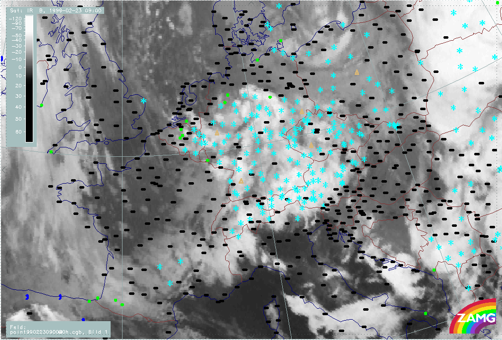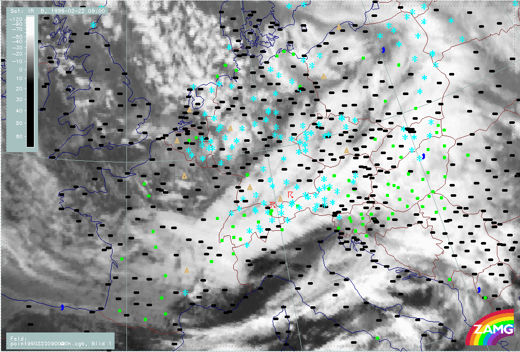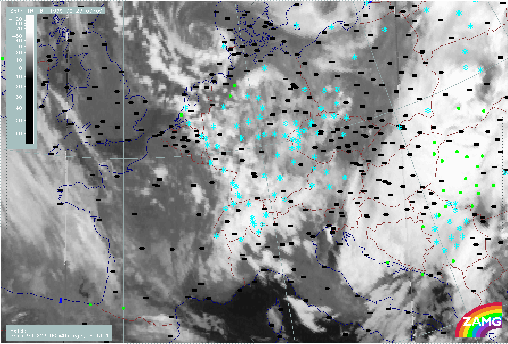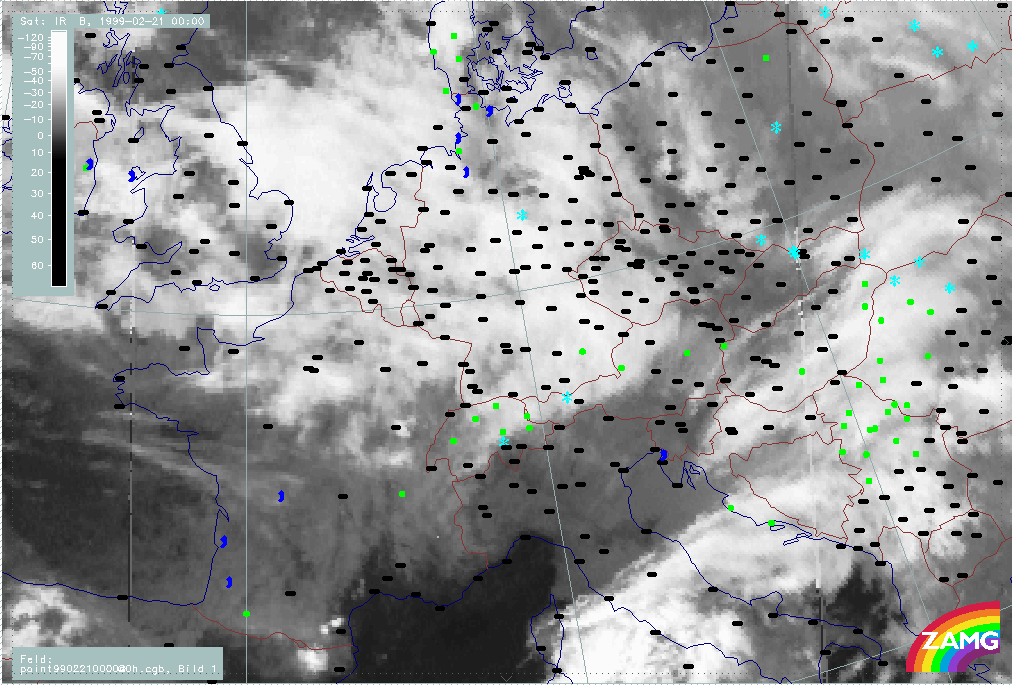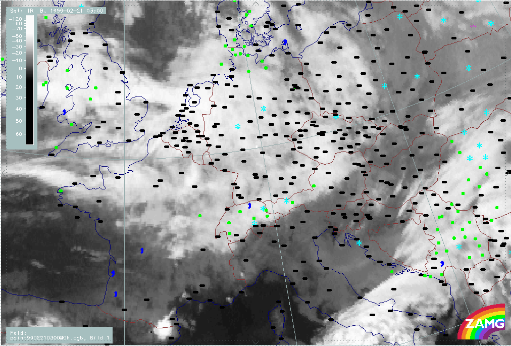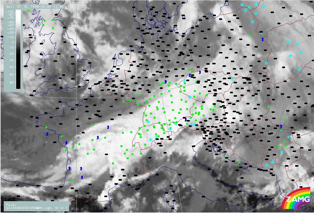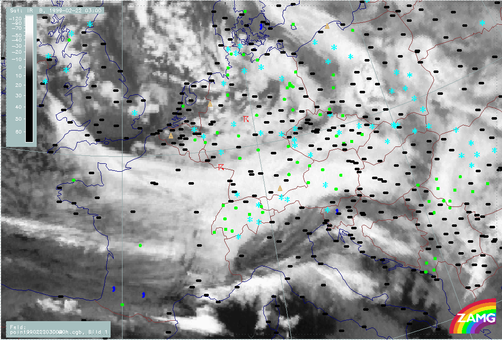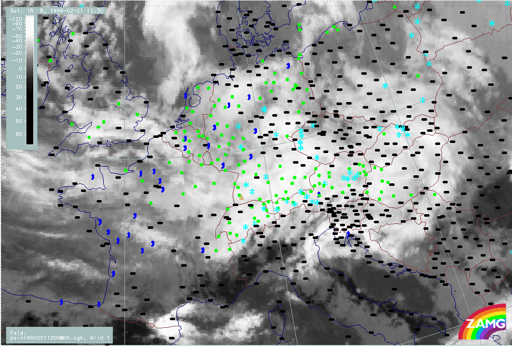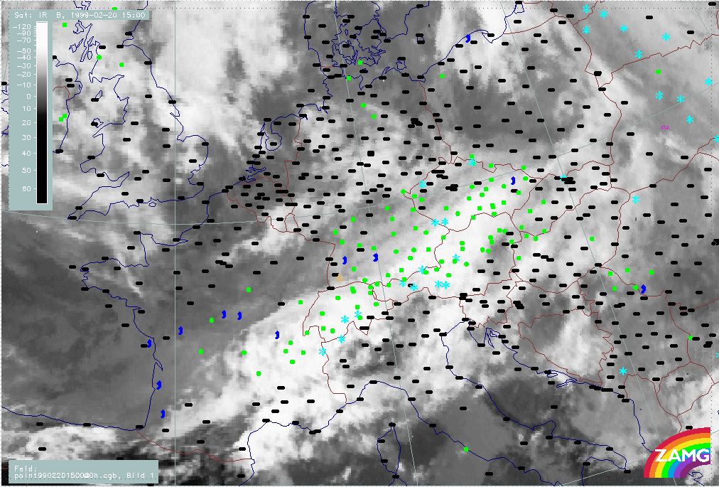 20 February 1999/21.00 UTC - Meteosat IR image; weather events (green: rain and showers, blue: drizzle, cyan: snow, red: thunderstorm with precipitation, purple: freezing rain, orange: