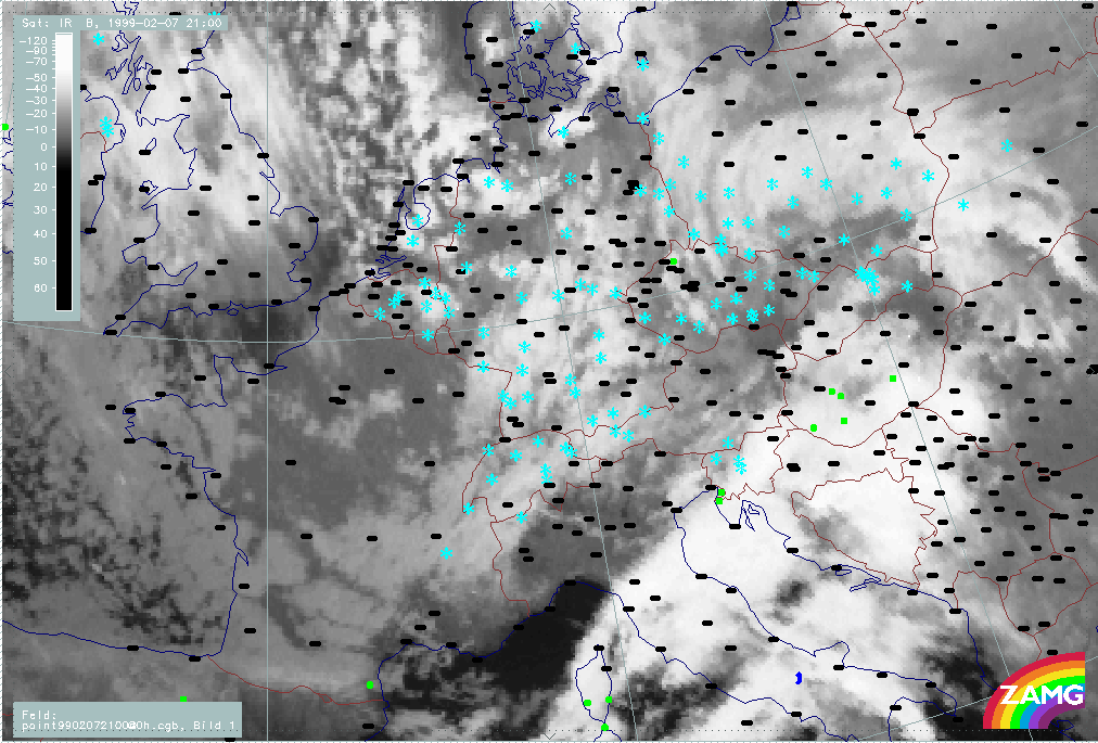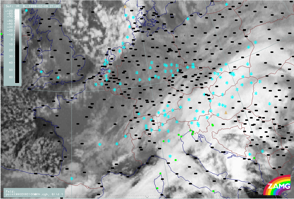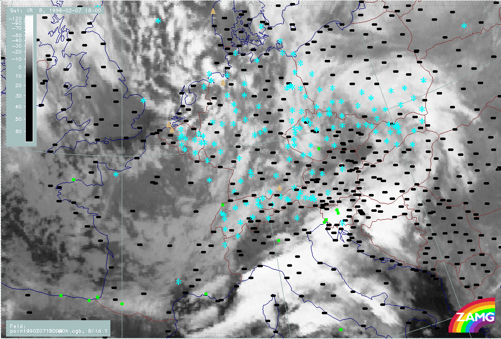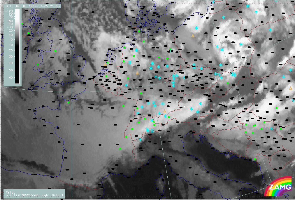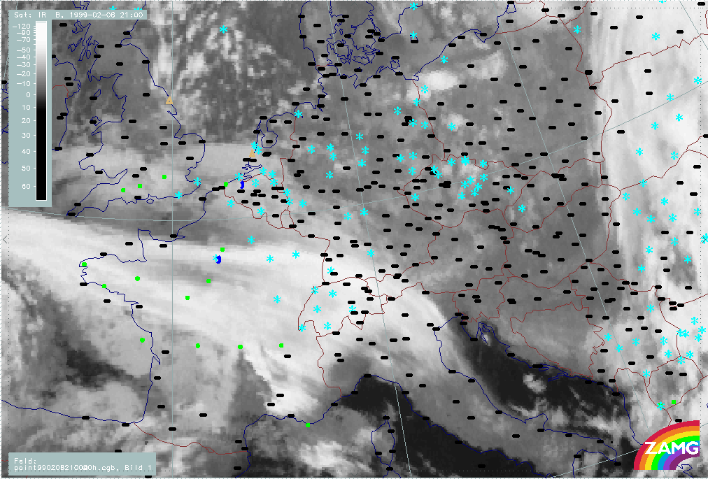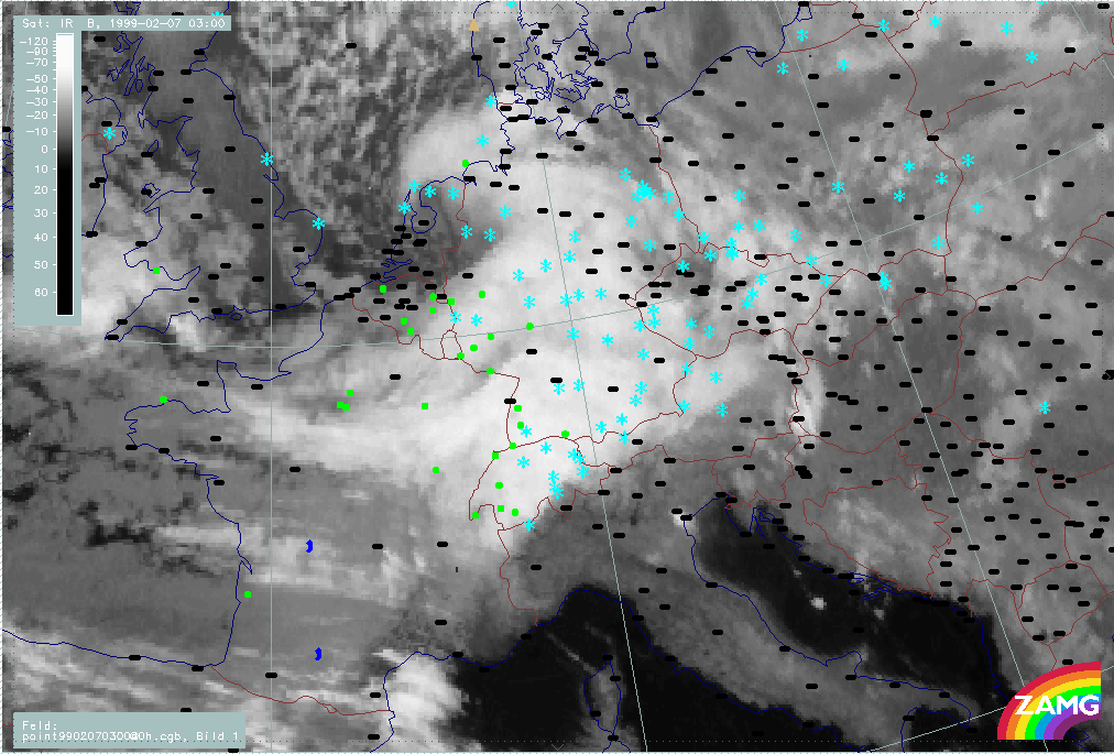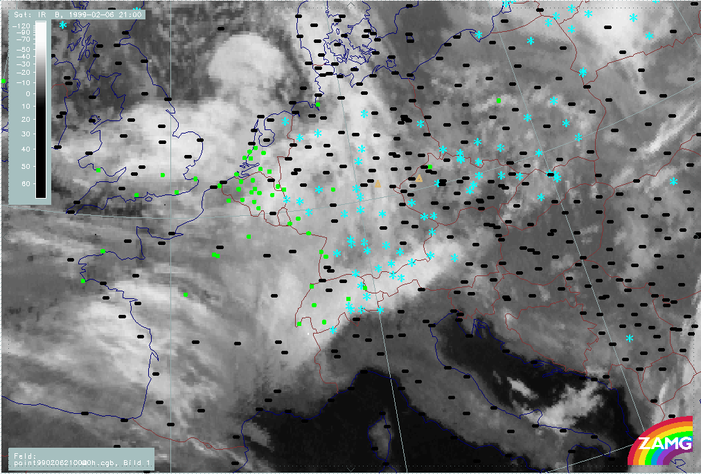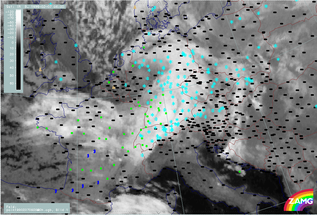 07 February 1999/21.00 UTC - Meteosat IR image; weather events (green: rain and showers, blue: drizzle, cyan: snow, red: thunderstorm with precipitation, purple: freezing rain, orange: