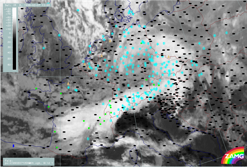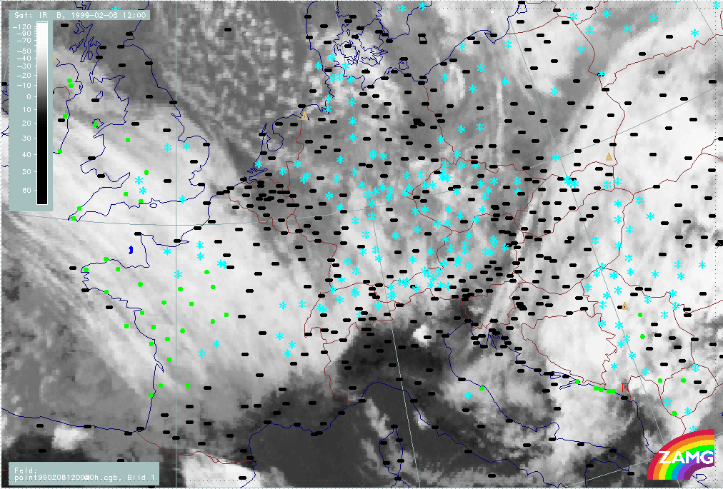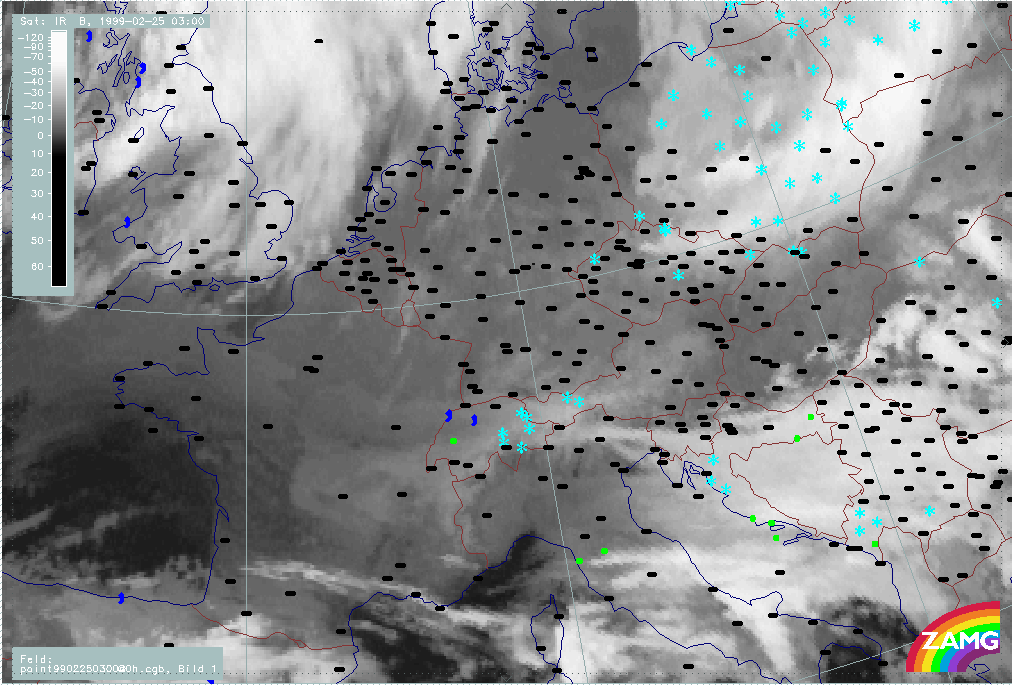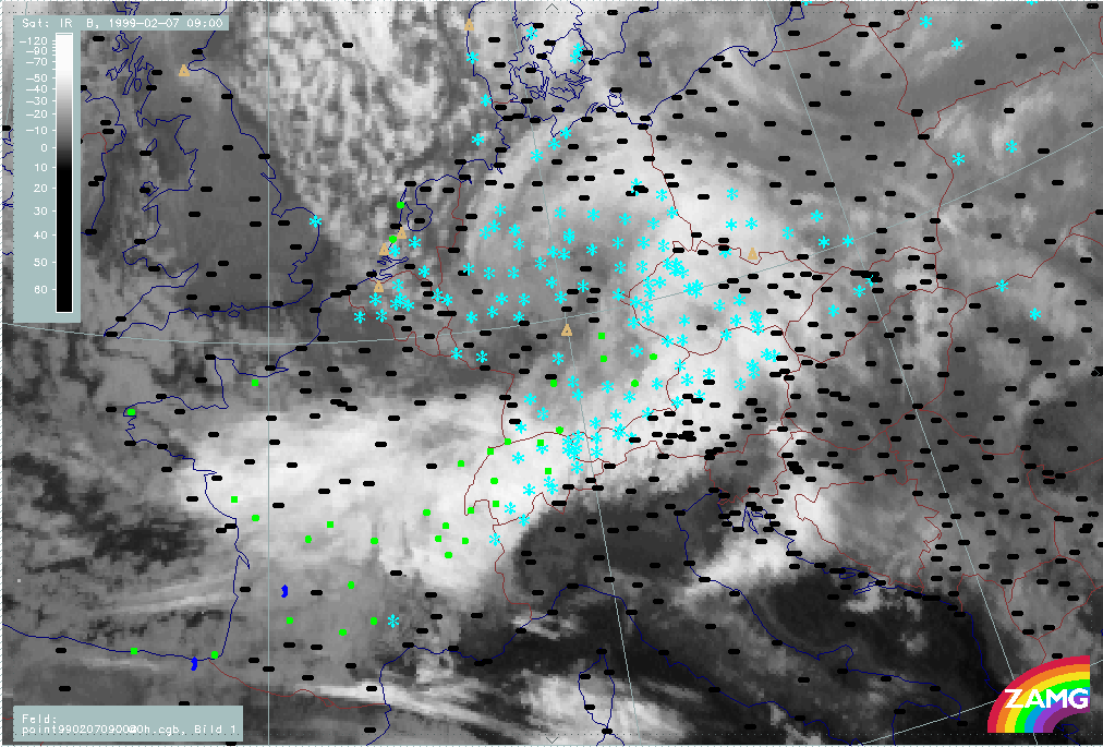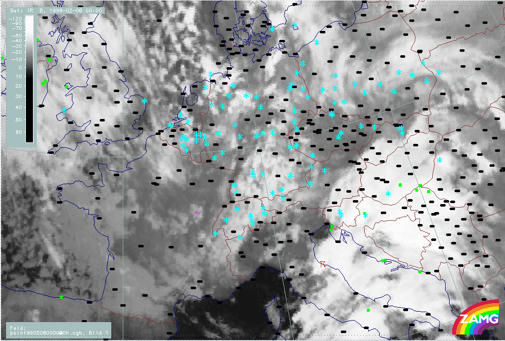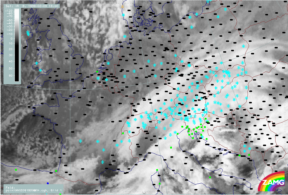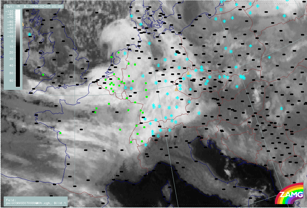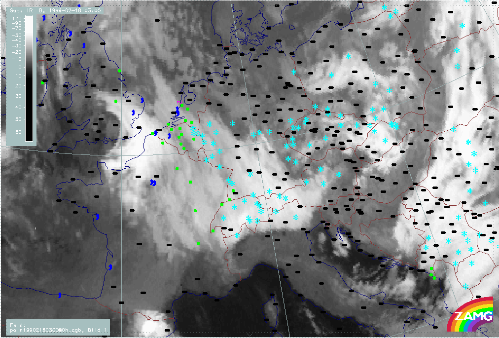 07 February 1999/21.00 UTC - Meteosat IR image; weather events (green: rain and showers, blue: drizzle, cyan: snow, red: thunderstorm with precipitation, purple: freezing rain, orange: