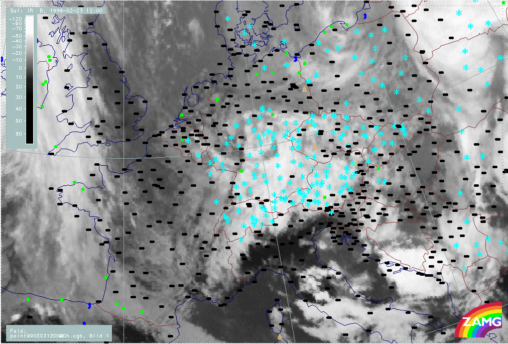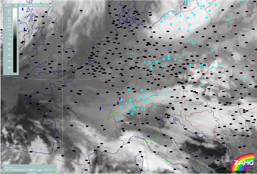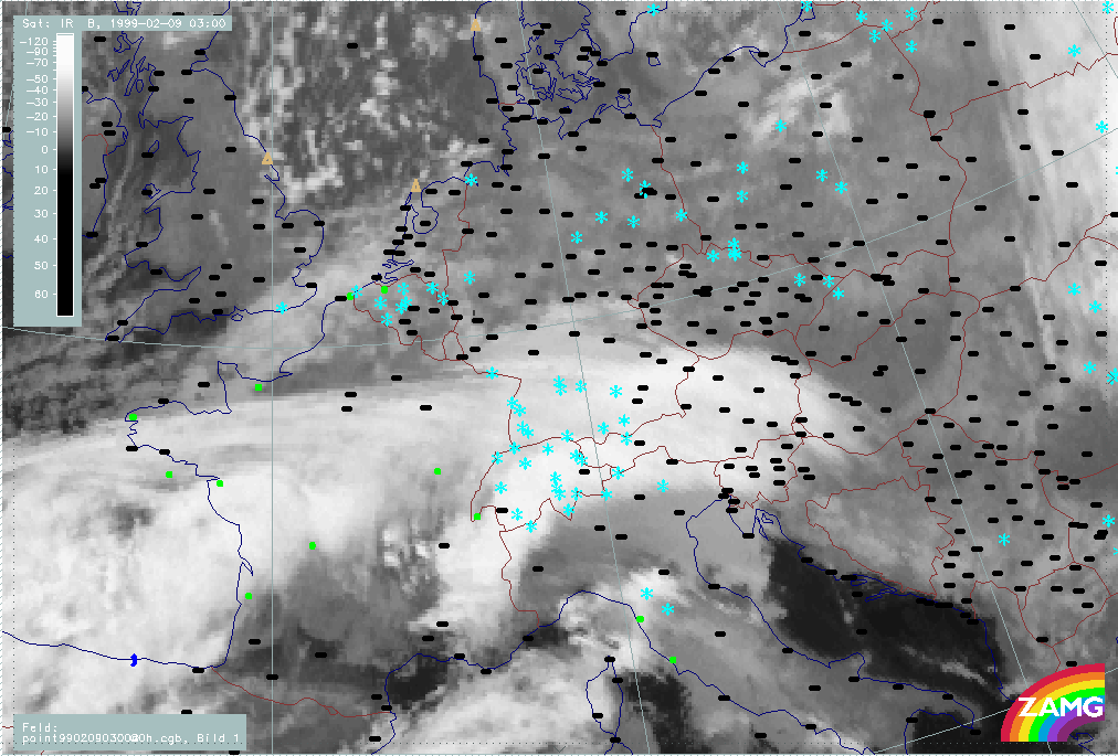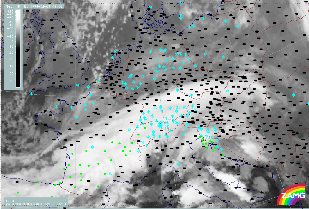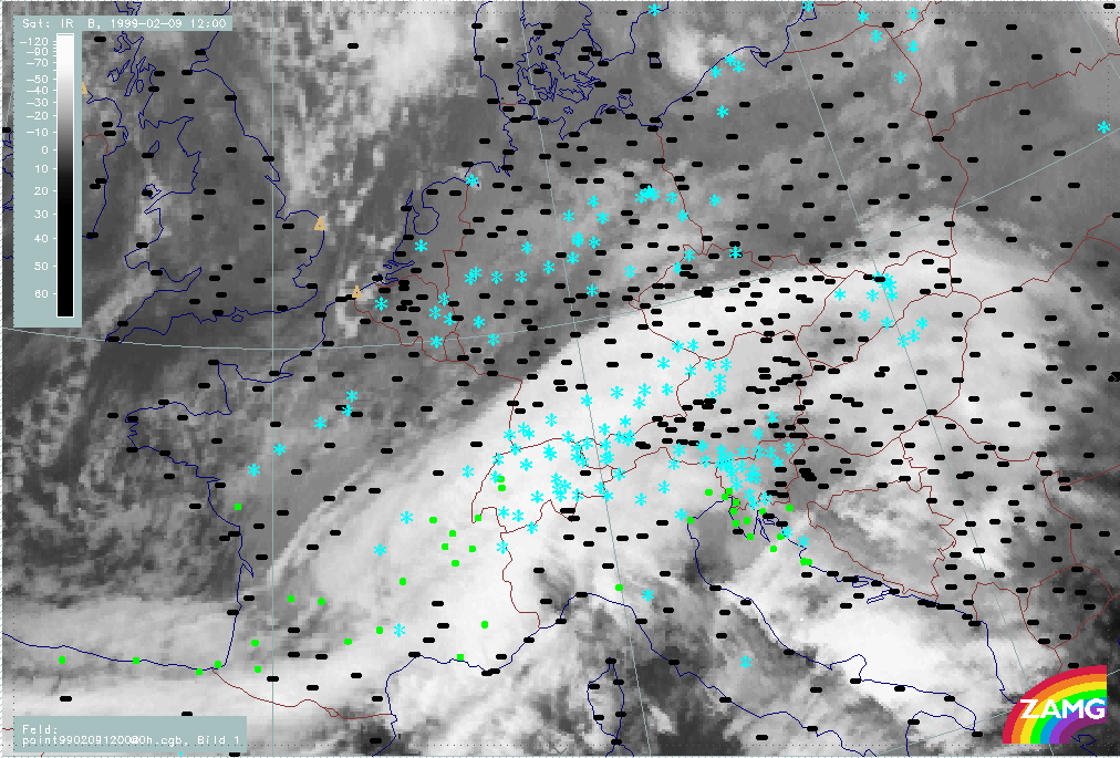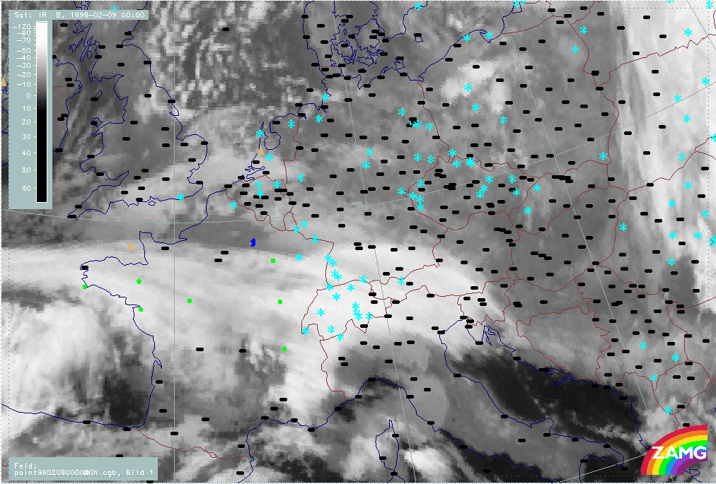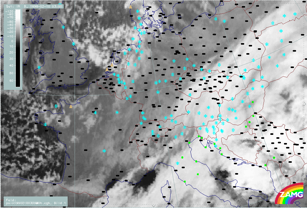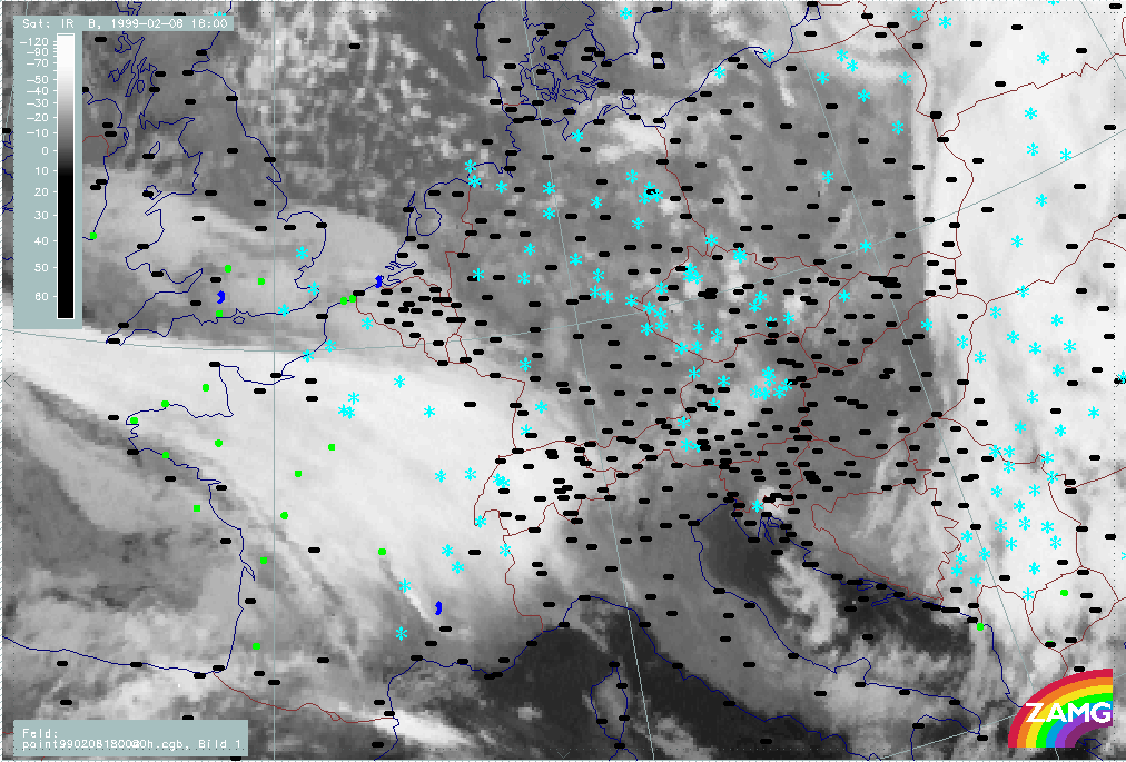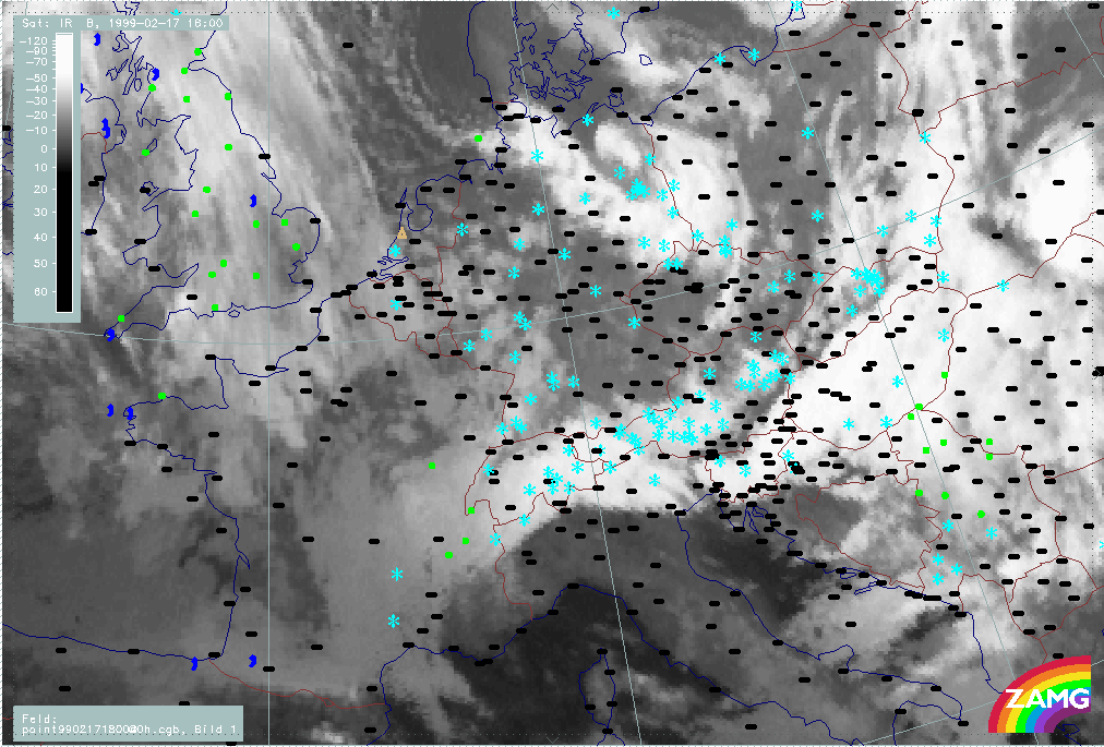 07 February 1999/21.00 UTC - Meteosat IR image; weather events (green: rain and showers, blue: drizzle, cyan: snow, red: thunderstorm with precipitation, purple: freezing rain, orange:
