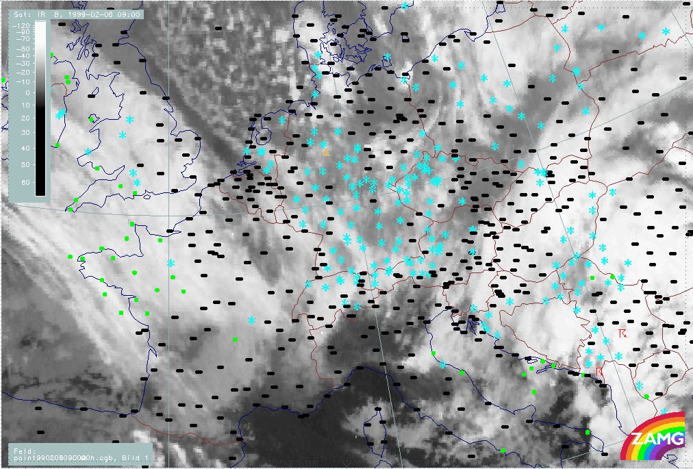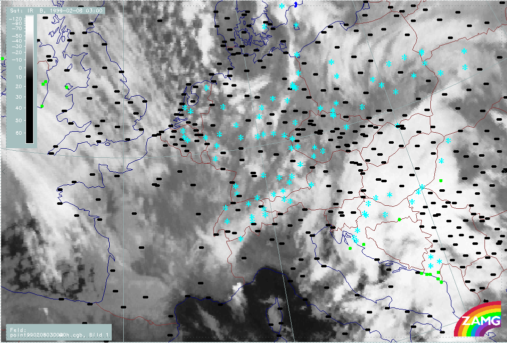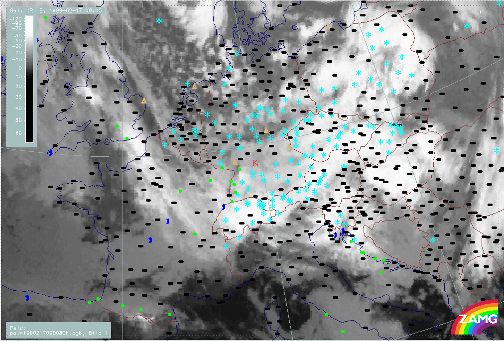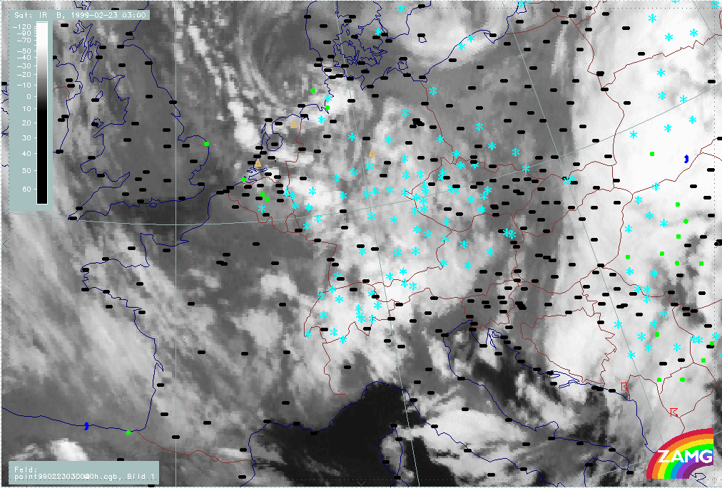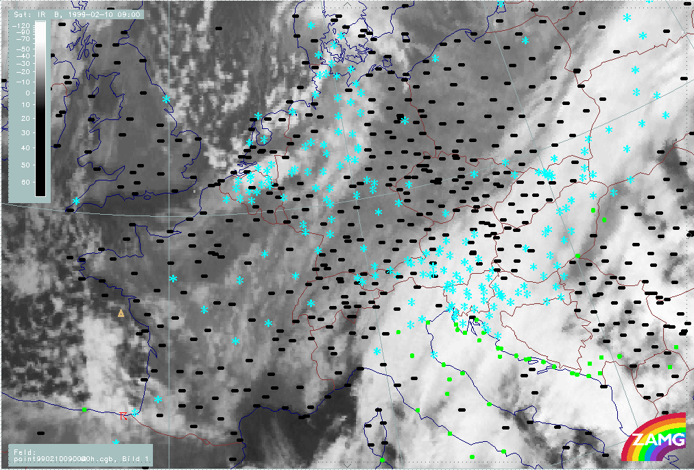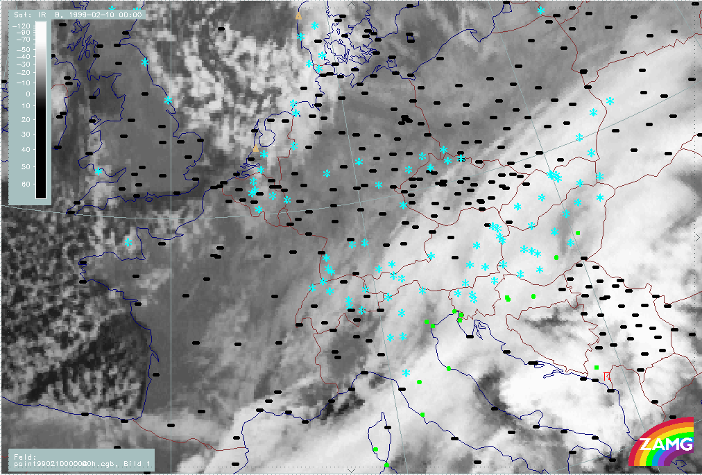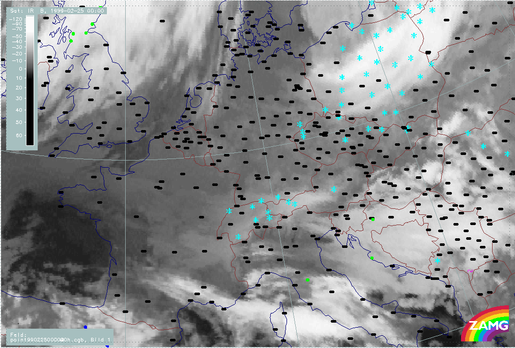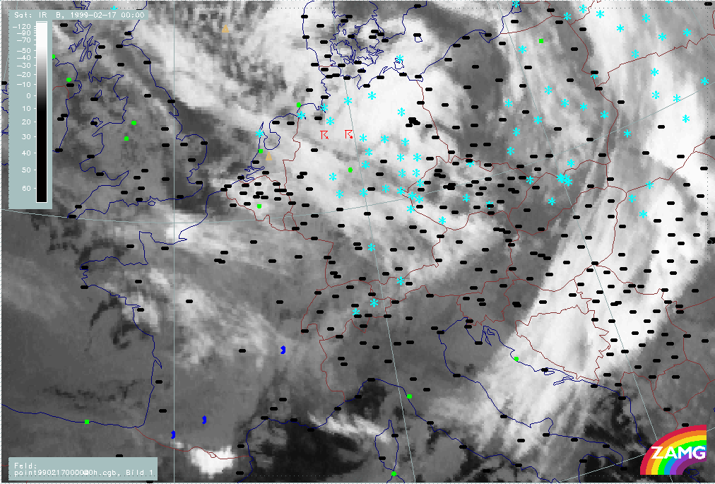 07 February 1999/21.00 UTC - Meteosat IR image; weather events (green: rain and showers, blue: drizzle, cyan: snow, red: thunderstorm with precipitation, purple: freezing rain, orange: