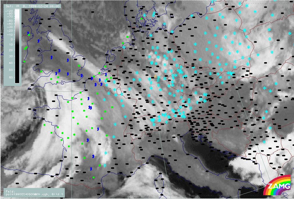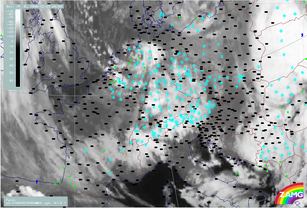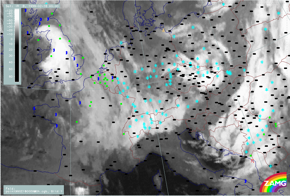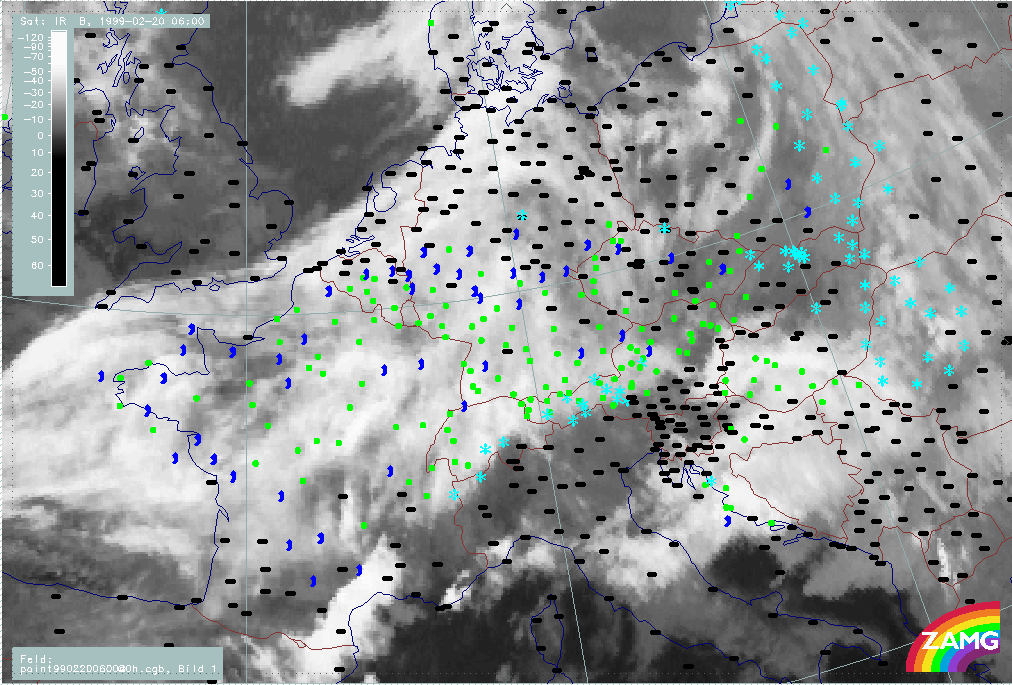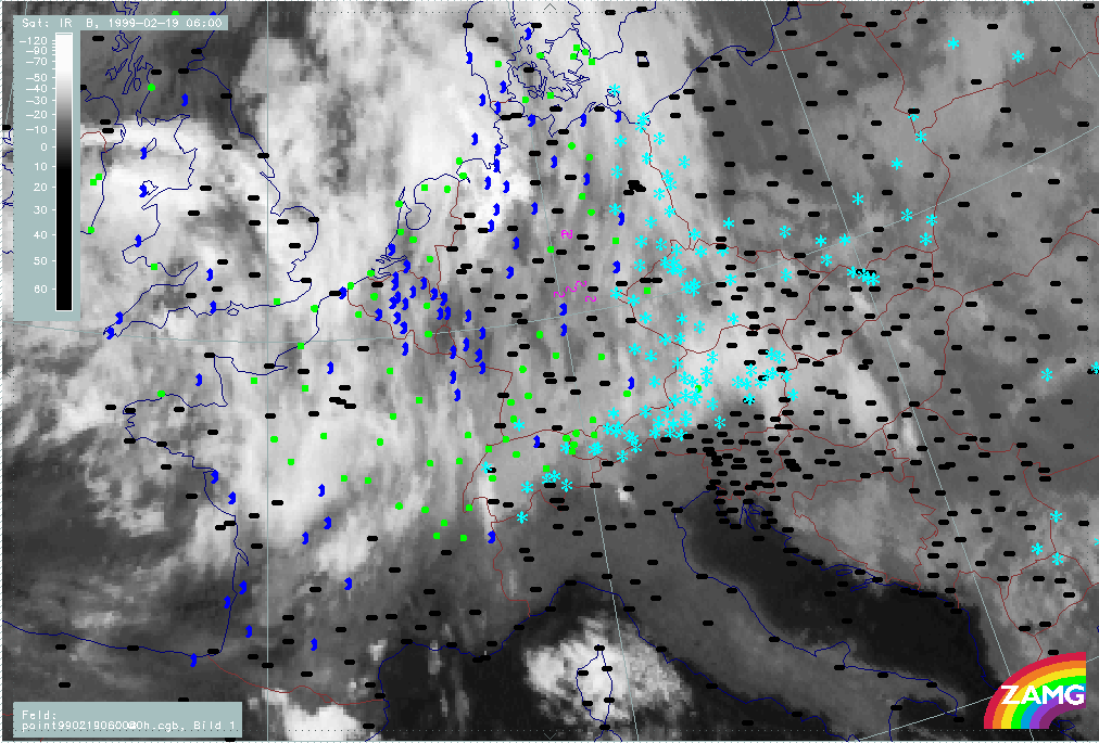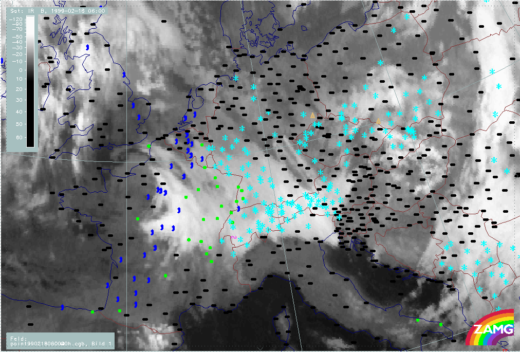 20 February 1999/06.00 UTC - Meteosat IR image; weather events (green: rain and showers, blue: drizzle, cyan: snow, red: thunderstorm with precipitation, purple: freezing rain, orange: