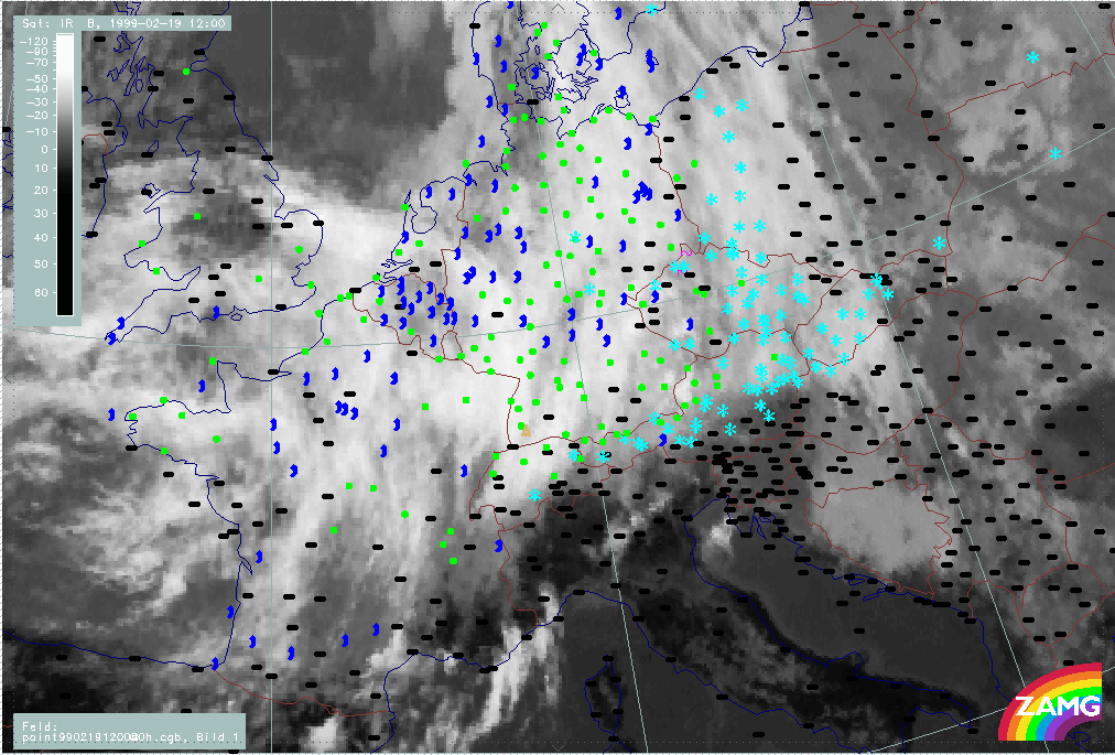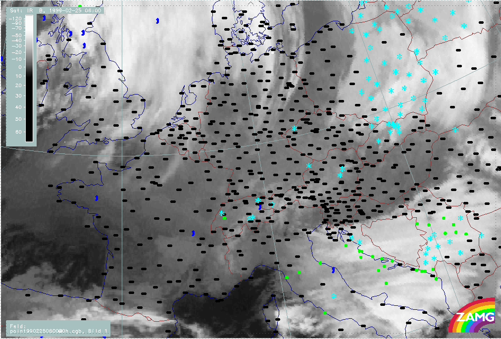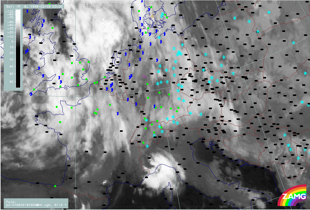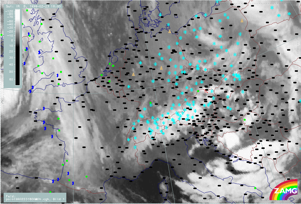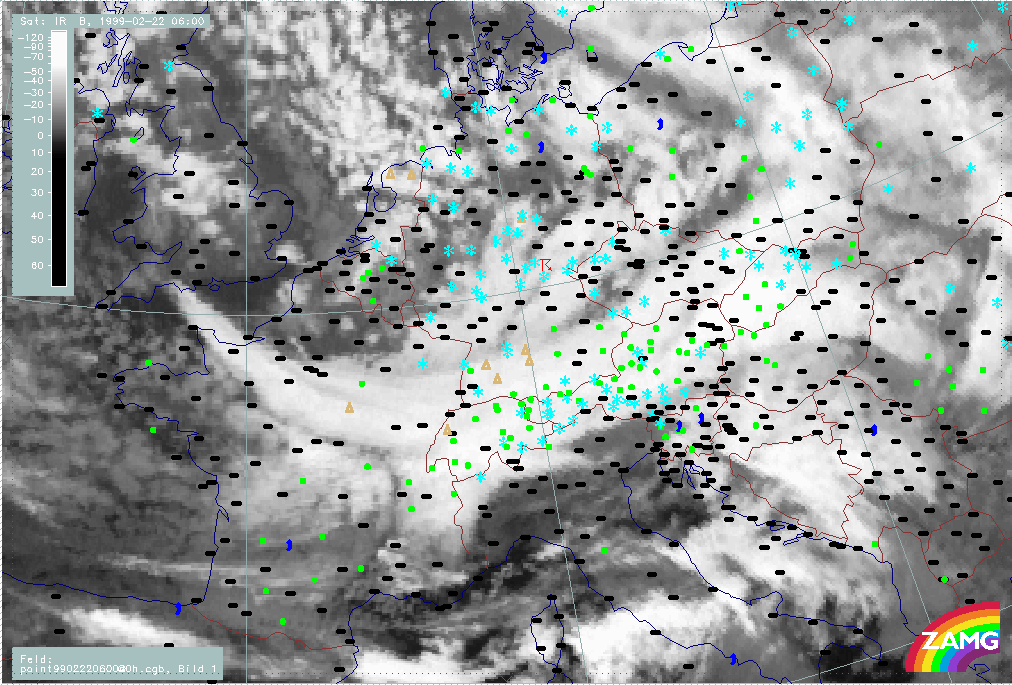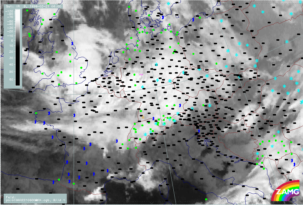 20 February 1999/06.00 UTC - Meteosat IR image; weather events (green: rain and showers, blue: drizzle, cyan: snow, red: thunderstorm with precipitation, purple: freezing rain, orange: