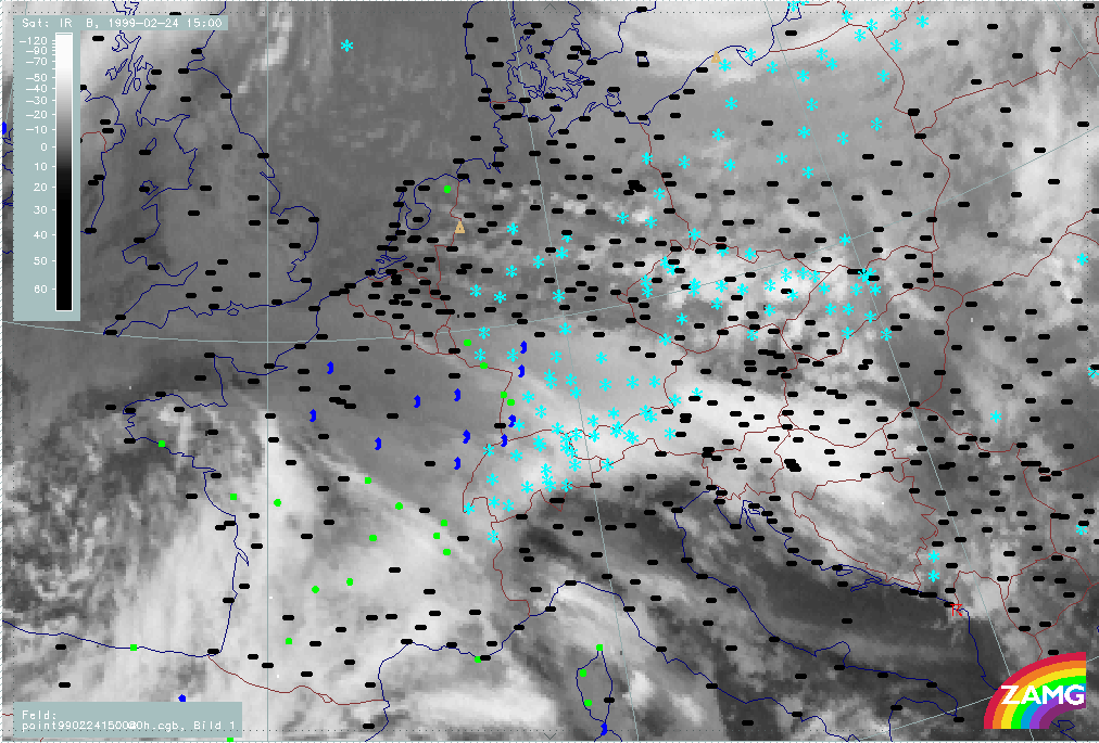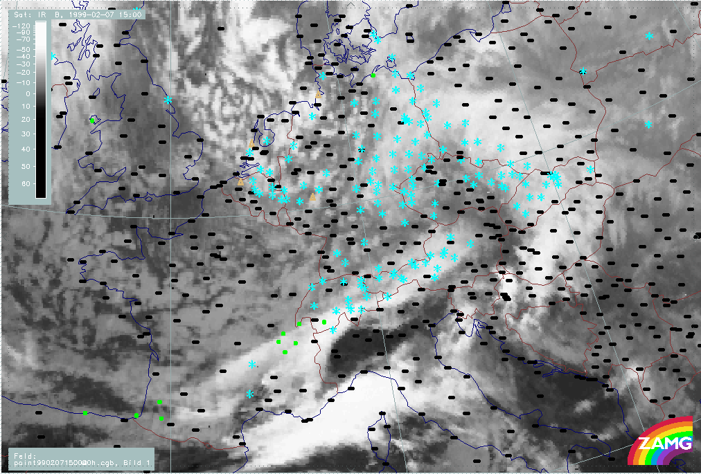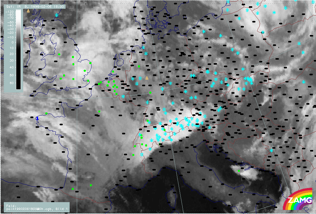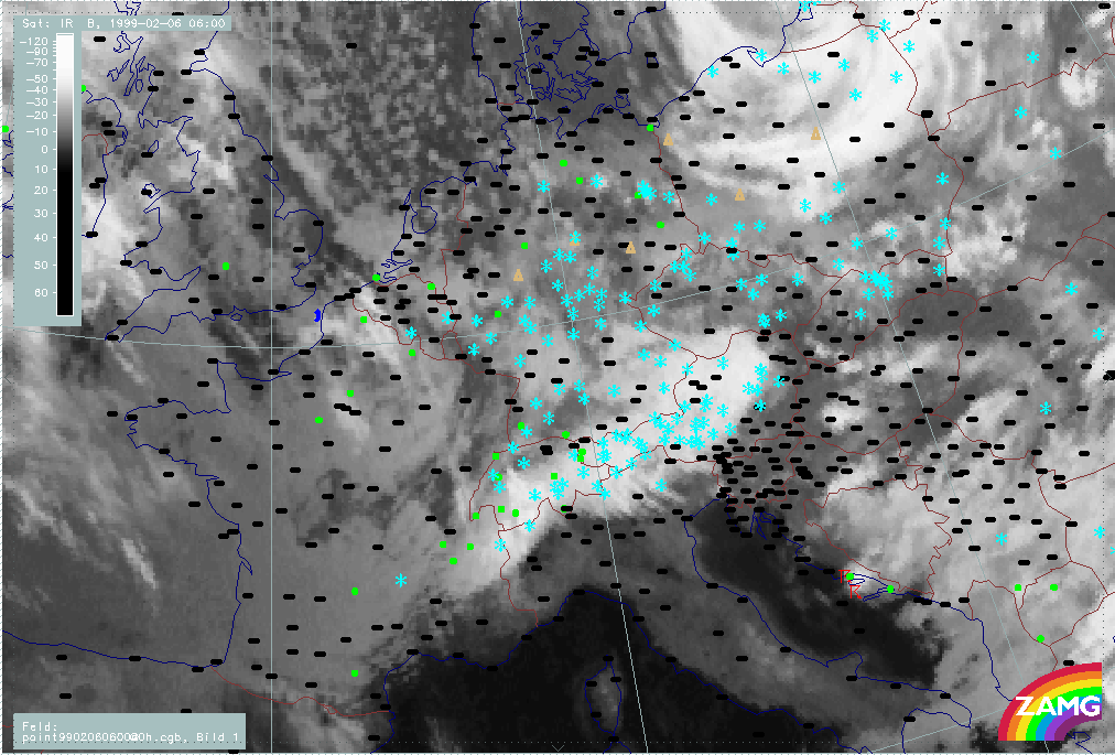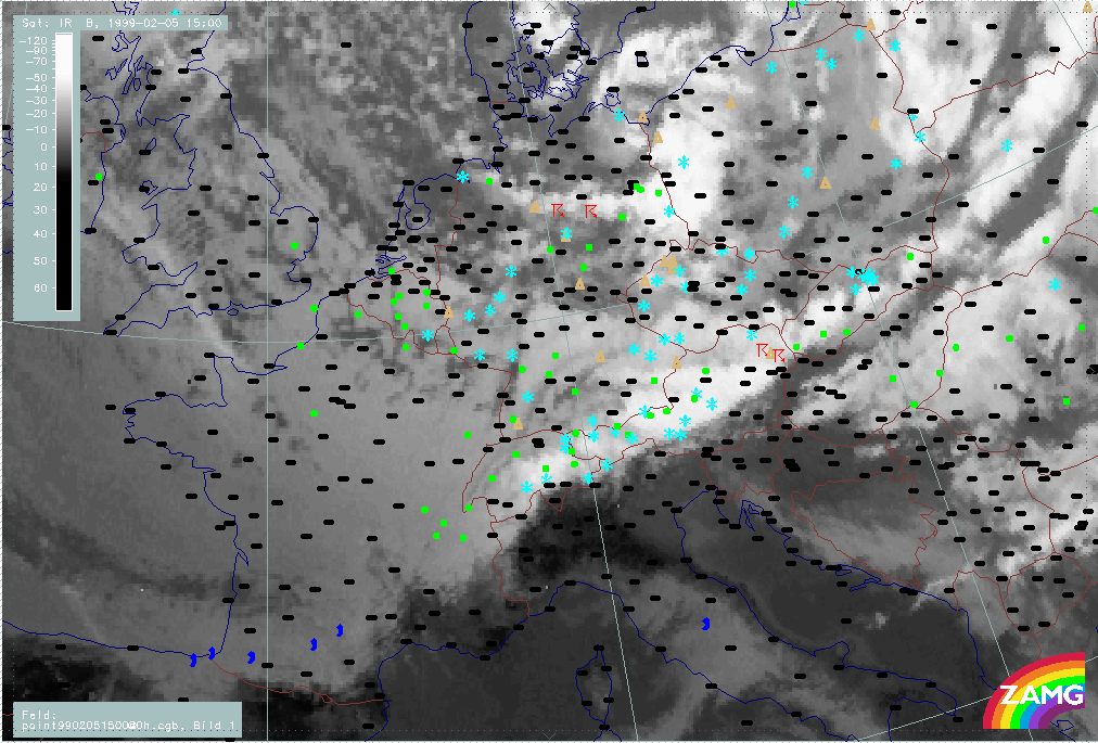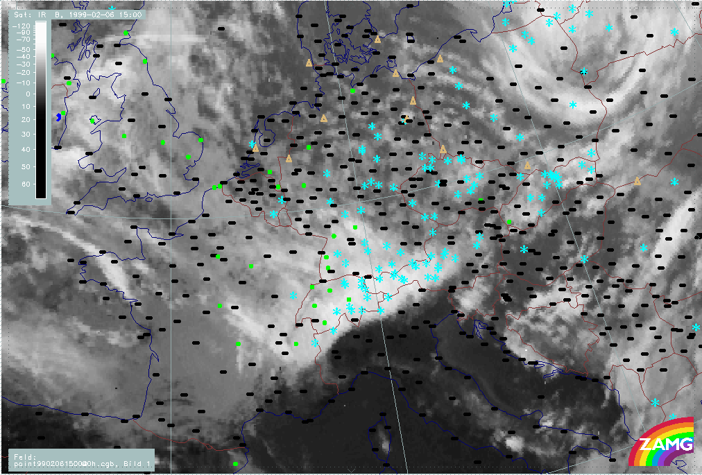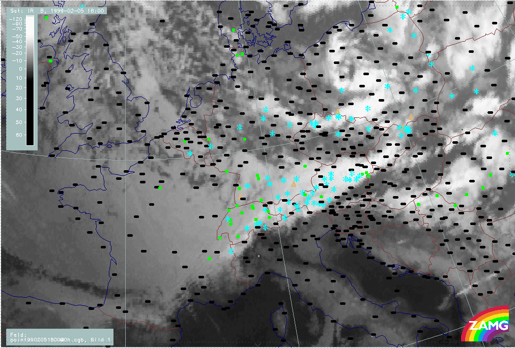 06 February 1999/15.00 UTC - Meteosat IR image; weather events (green: rain and showers, blue: drizzle, cyan: snow, red: thunderstorm with precipitation, purple: freezing rain, orange: