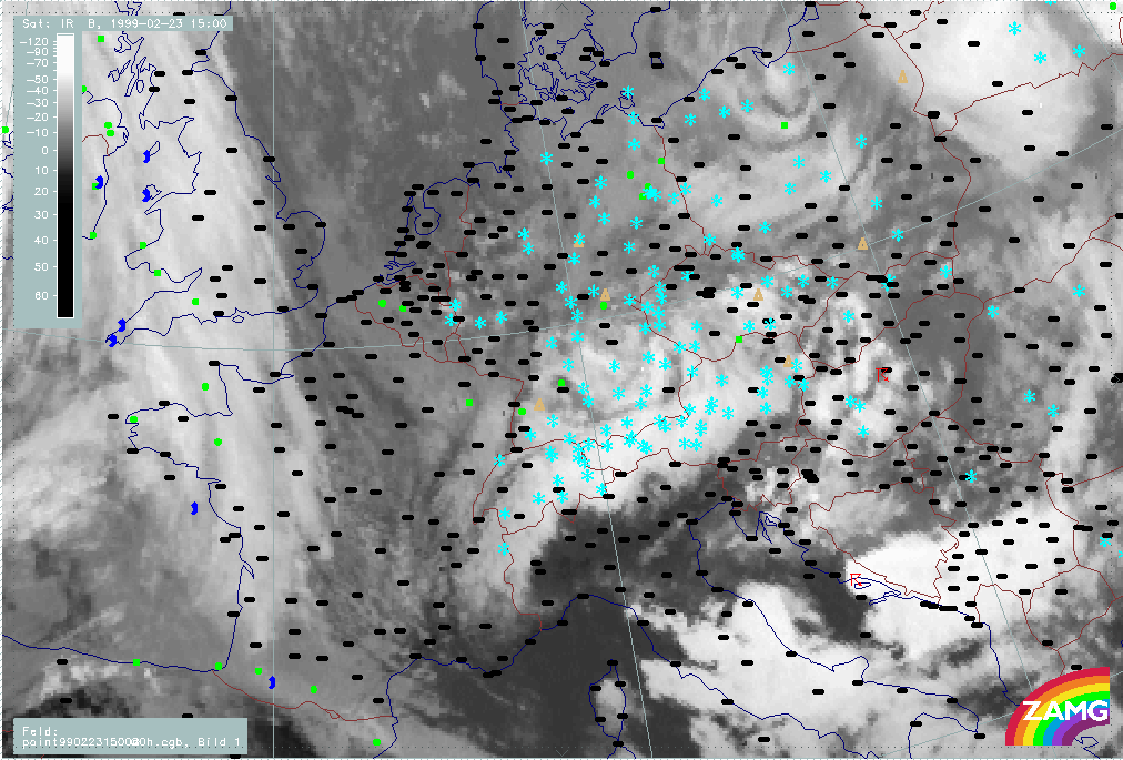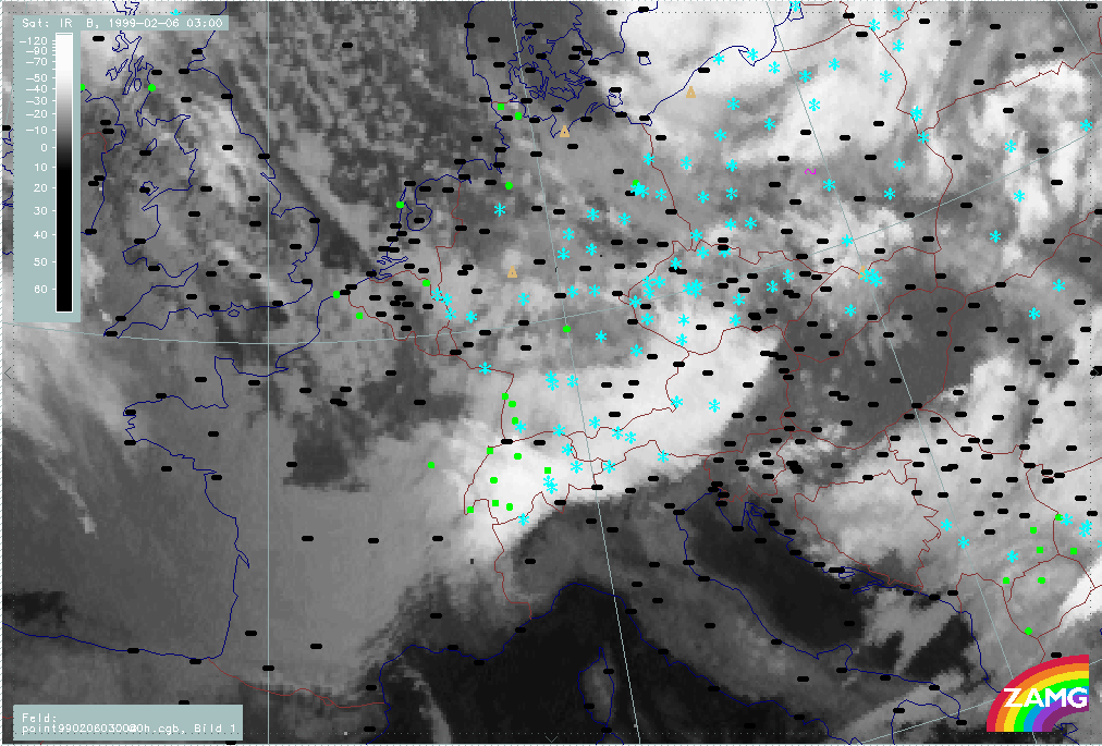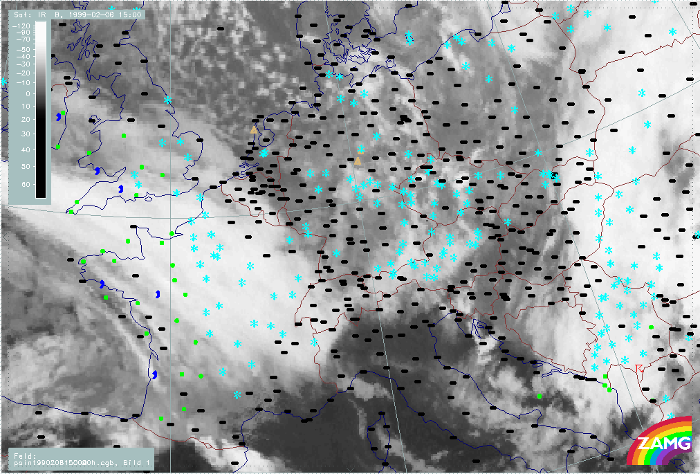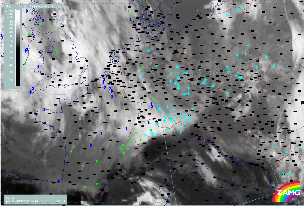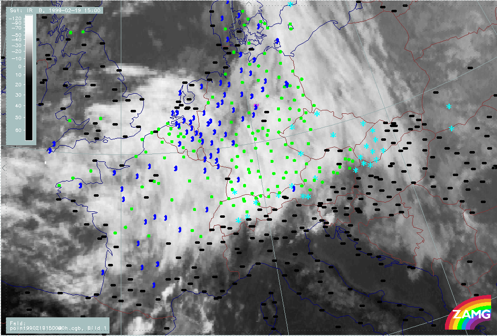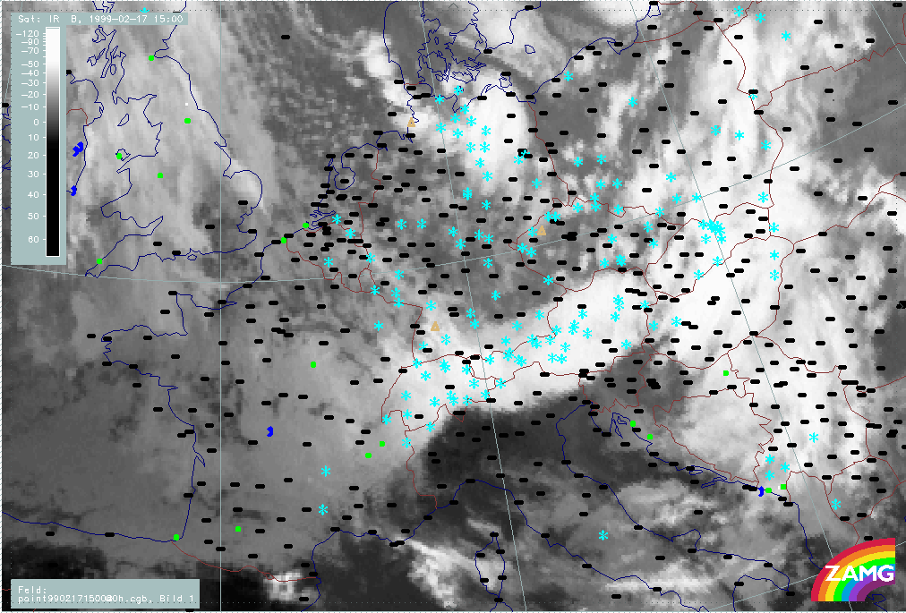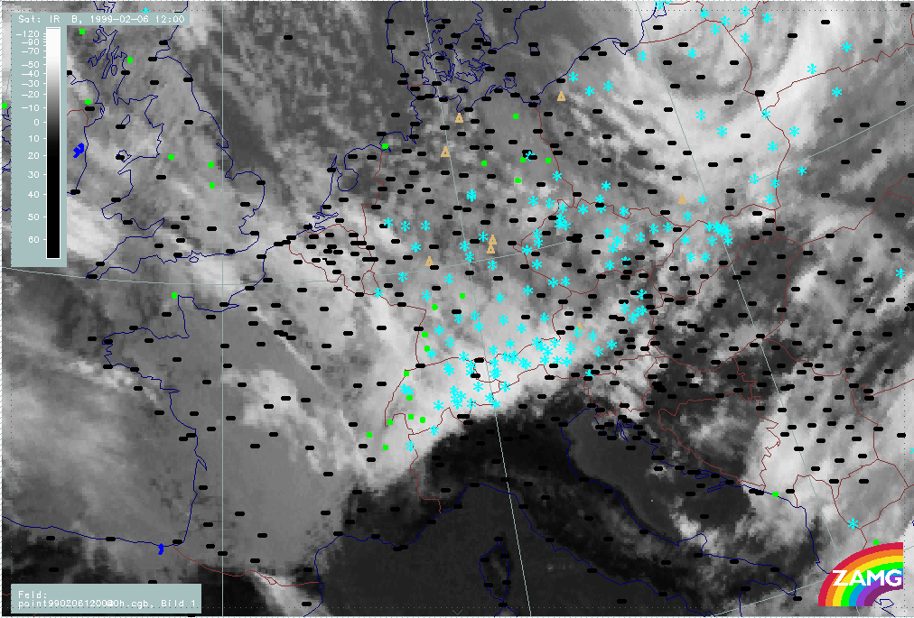 06 February 1999/15.00 UTC - Meteosat IR image; weather events (green: rain and showers, blue: drizzle, cyan: snow, red: thunderstorm with precipitation, purple: freezing rain, orange: