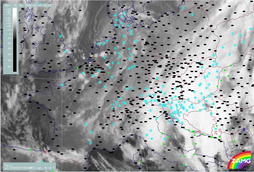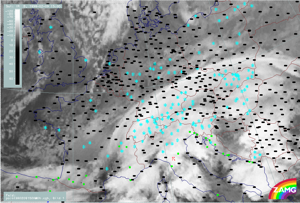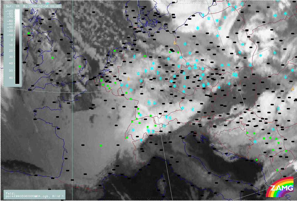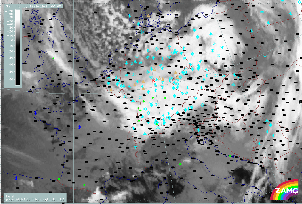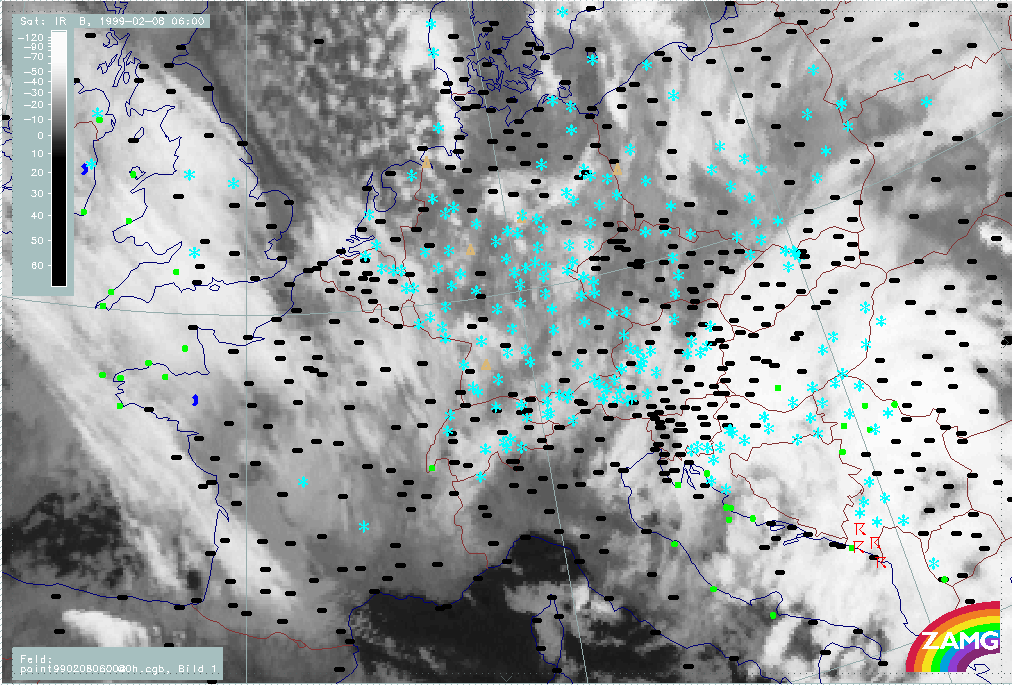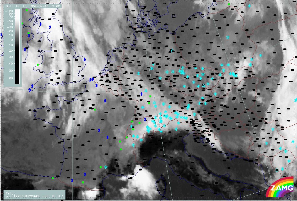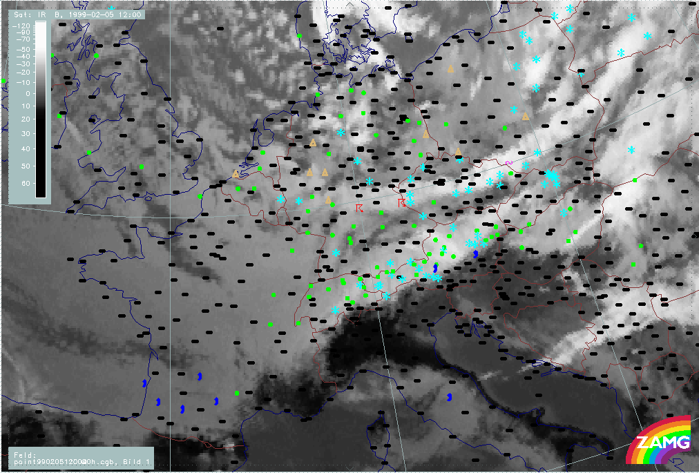 06 February 1999/15.00 UTC - Meteosat IR image; weather events (green: rain and showers, blue: drizzle, cyan: snow, red: thunderstorm with precipitation, purple: freezing rain, orange: