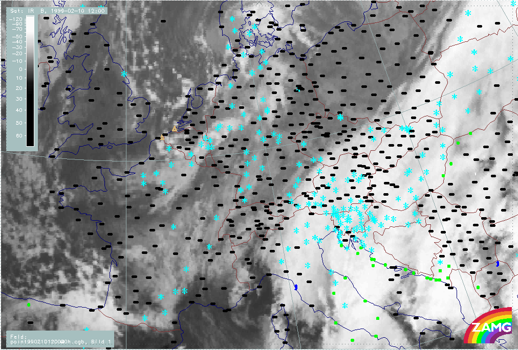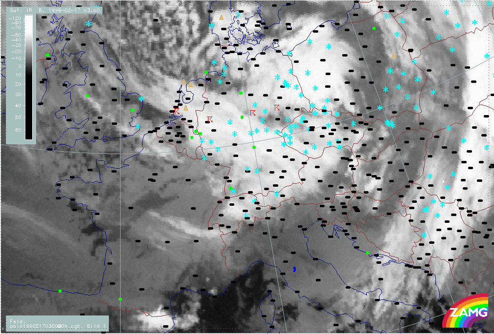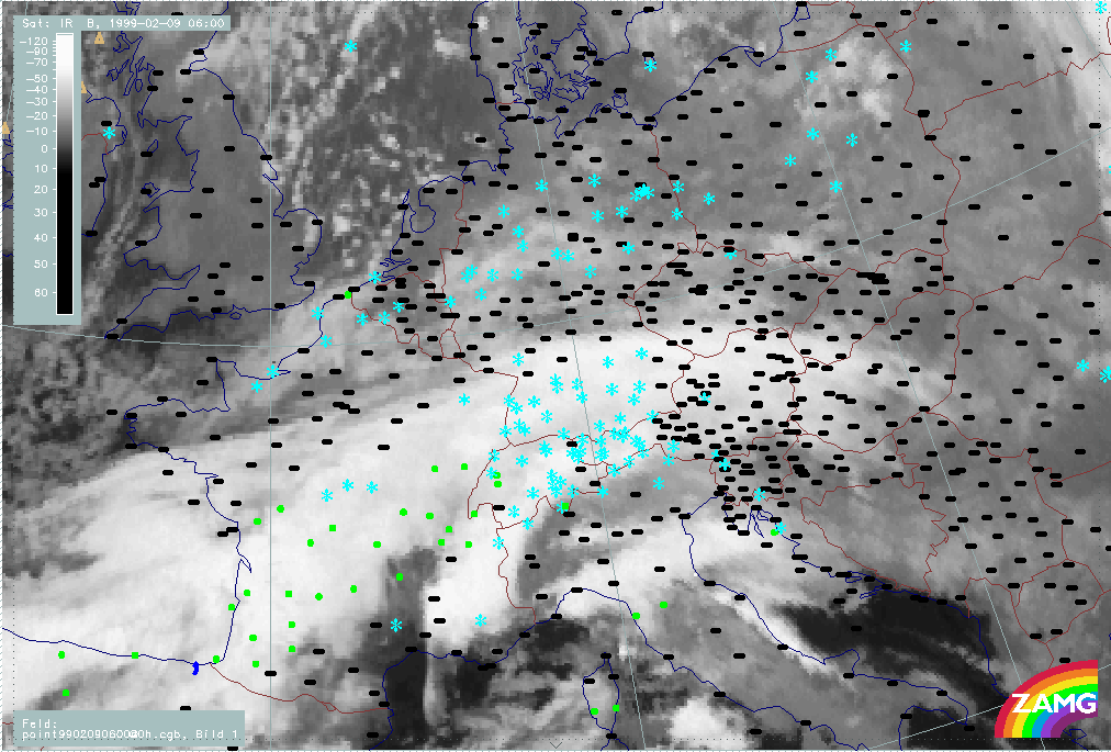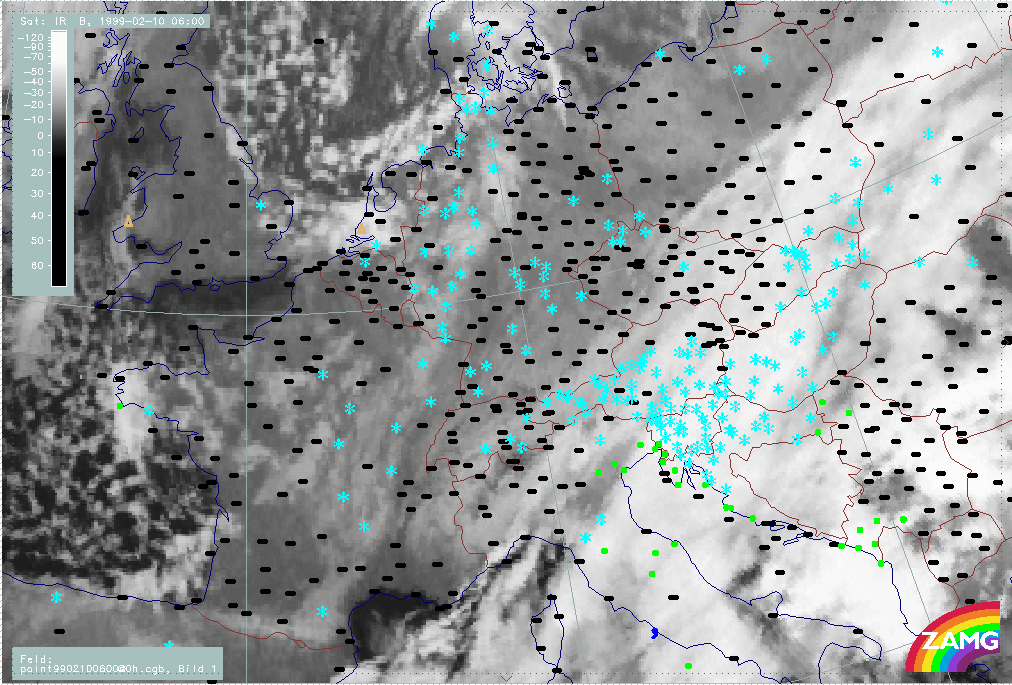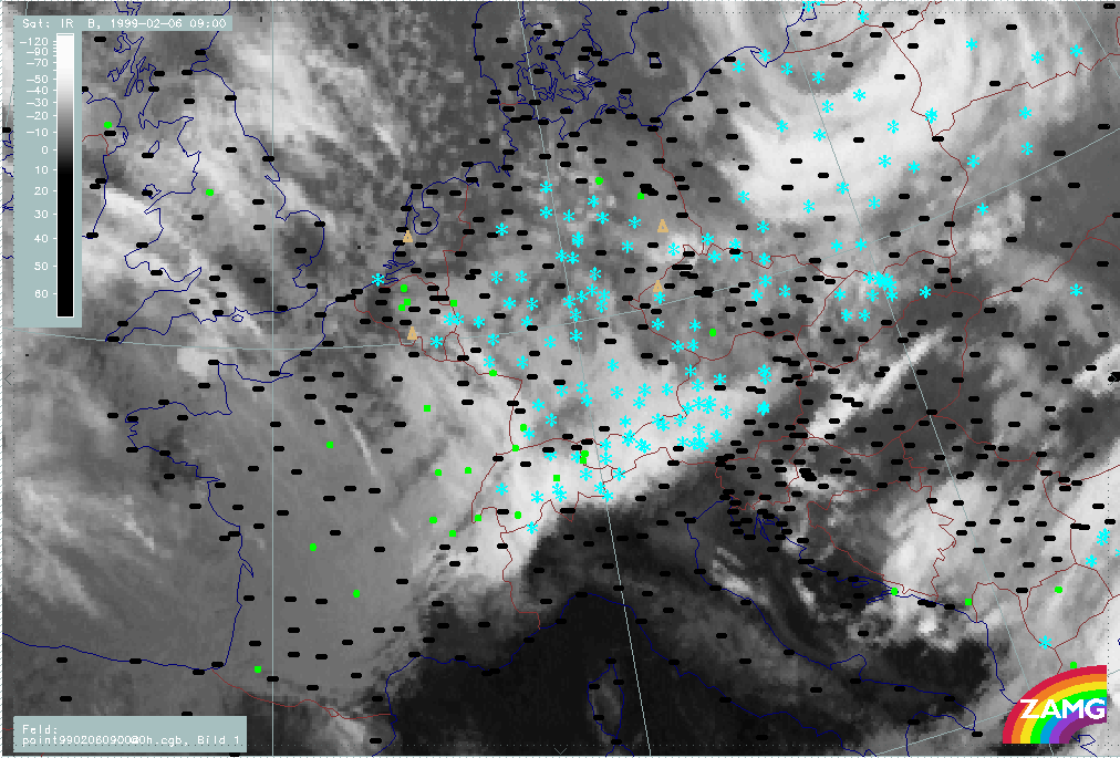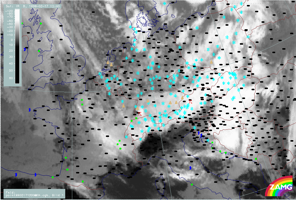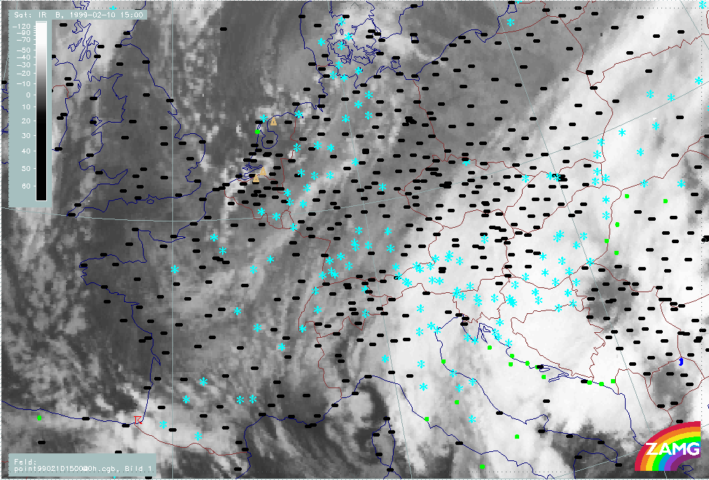 06 February 1999/15.00 UTC - Meteosat IR image; weather events (green: rain and showers, blue: drizzle, cyan: snow, red: thunderstorm with precipitation, purple: freezing rain, orange:
