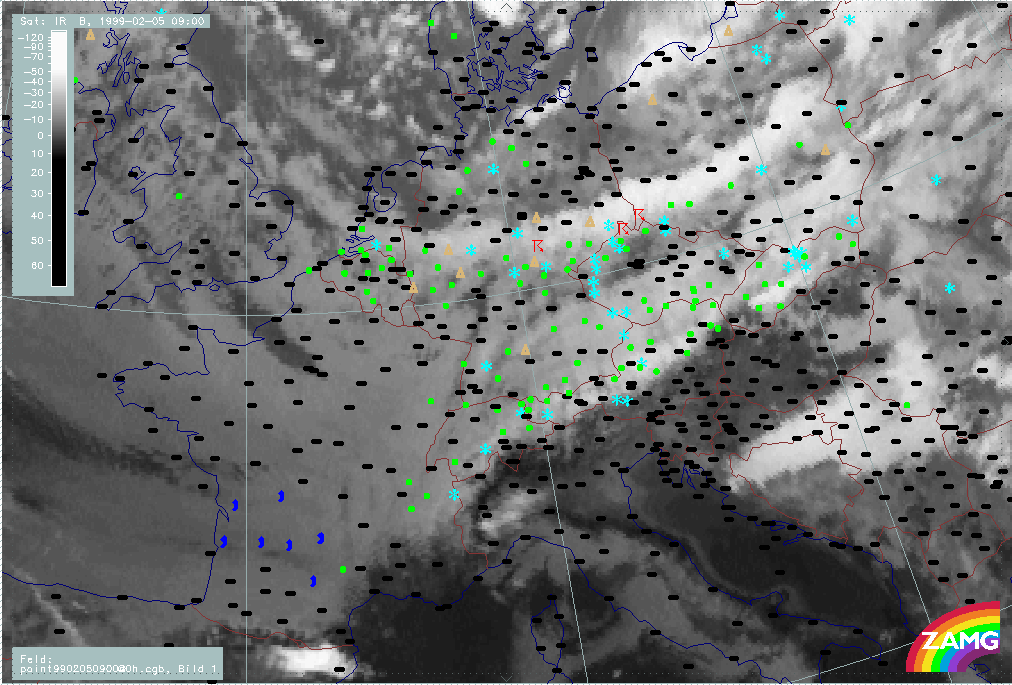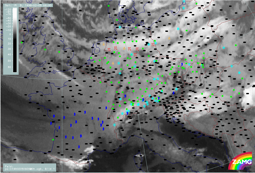 05 February 1999/06.00 UTC - Meteosat IR image; weather events (green: rain and showers, blue: drizzle, cyan: snow, red: thunderstorm with precipitation, purple: freezing rain, orange: