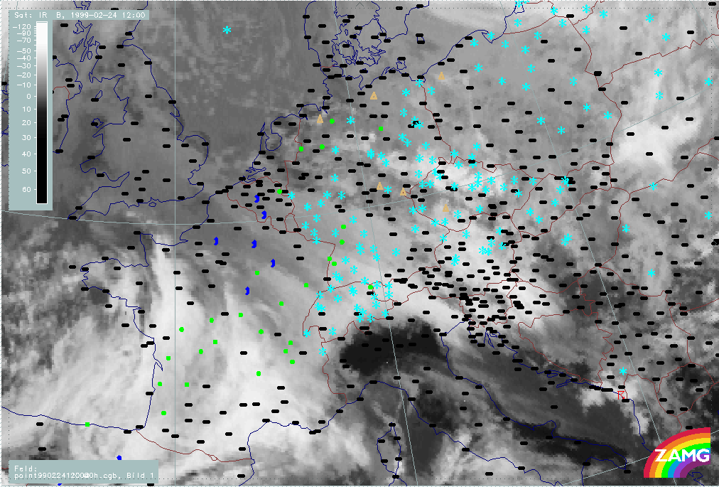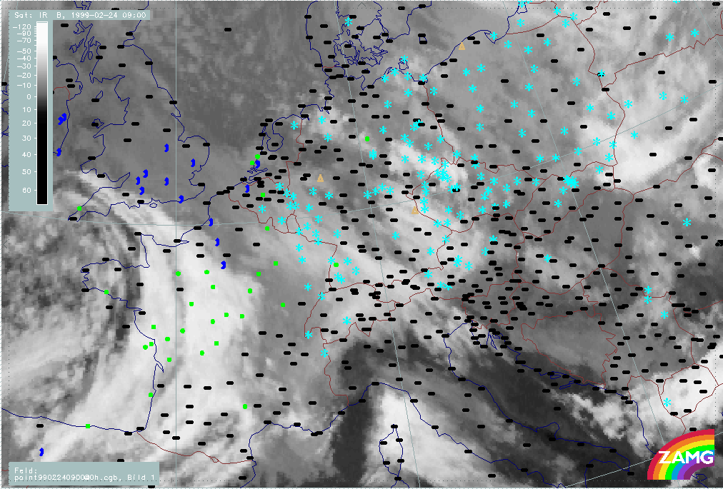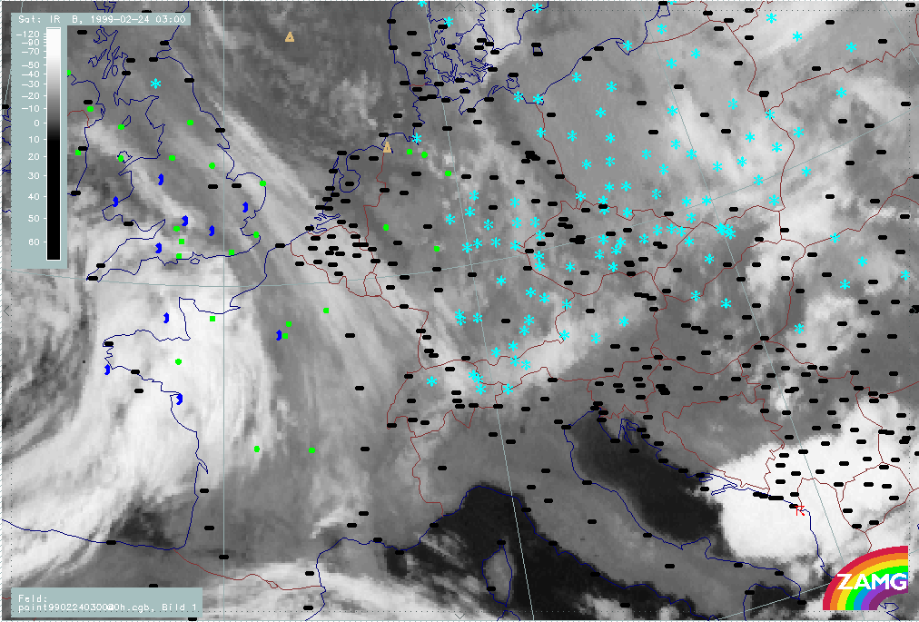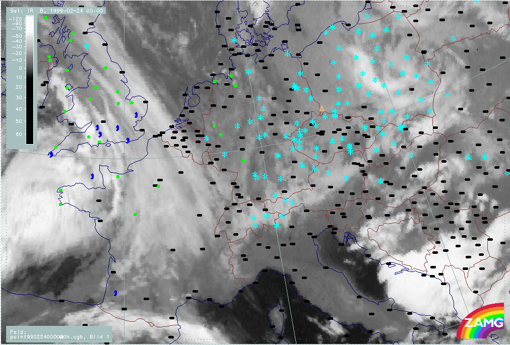 24 February 1999/00.00 UTC - Meteosat IR image; weather events (green: rain and showers, blue: drizzle, cyan: snow, red: thunderstorm with precipitation, purple: freezing rain, orange: hail, black: no actual precipitation or thunderstorm with precipitation); 24/00.00 - 24/18.00 UTC 3-hourly image loop
