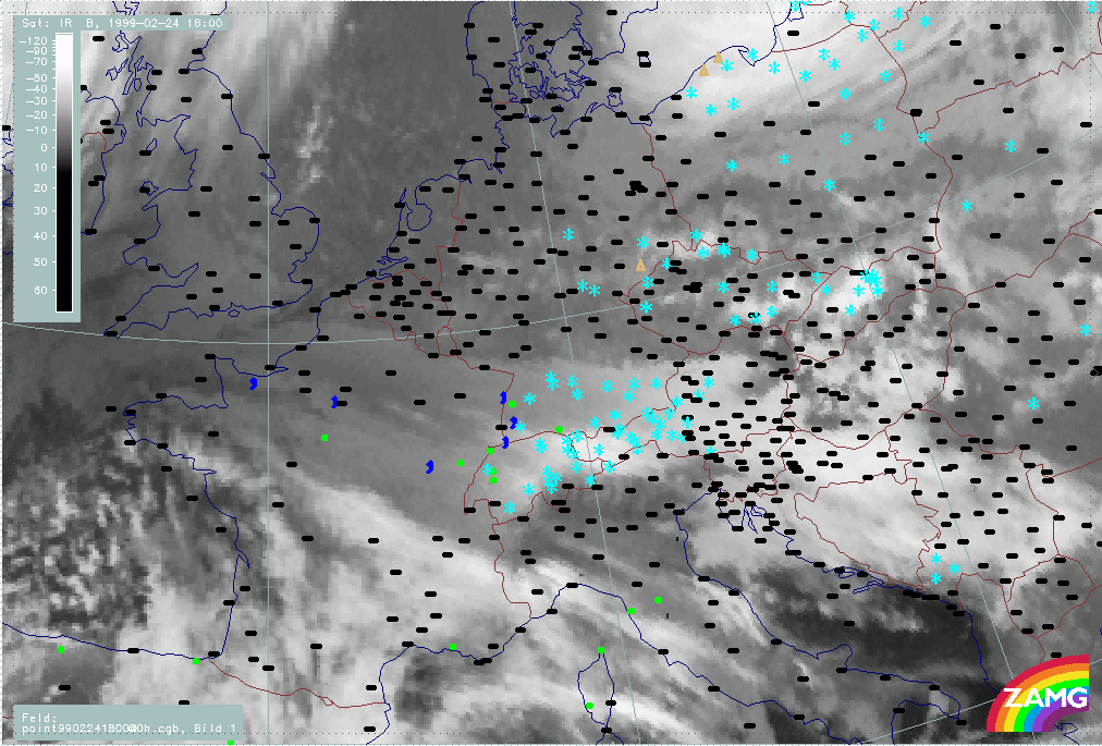 24 February 1999/18.00 UTC - Meteosat IR image; weather events (green: rain and showers, blue: drizzle, cyan: snow, red: thunderstorm with precipitation, purple: freezing rain, orange: hail, black: no actual precipitation or thunderstorm with precipitation); 24/18.00 - 25/06.00 UTC 3-hourly image loop