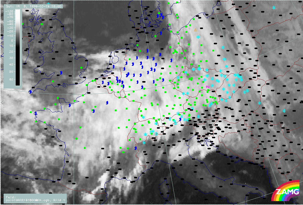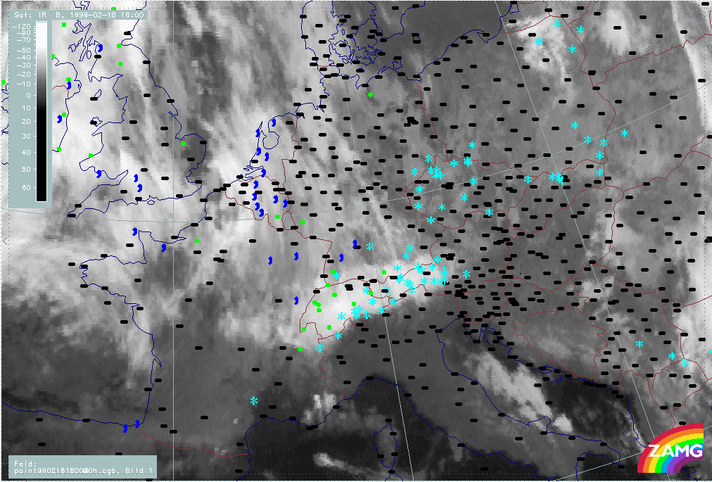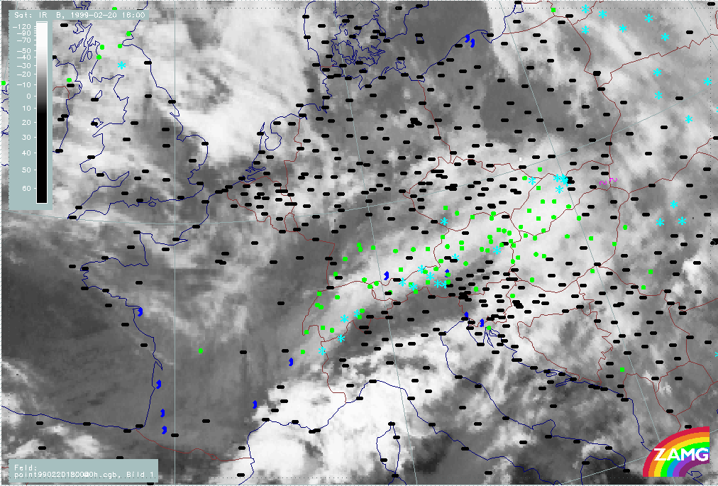 20 February 1999/18.00 UTC - Meteosat IR image; weather events (green: rain and showers, blue: drizzle, cyan: snow, red: thunderstorm with precipitation, purple: freezing rain, orange: