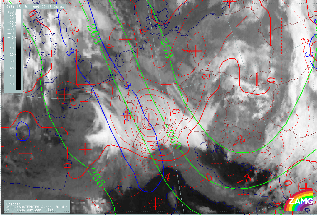 18 February 1999/06.00 UTC - Meteosat IR image; red: height contours 1000 hPa, green: height contours 500 hPa