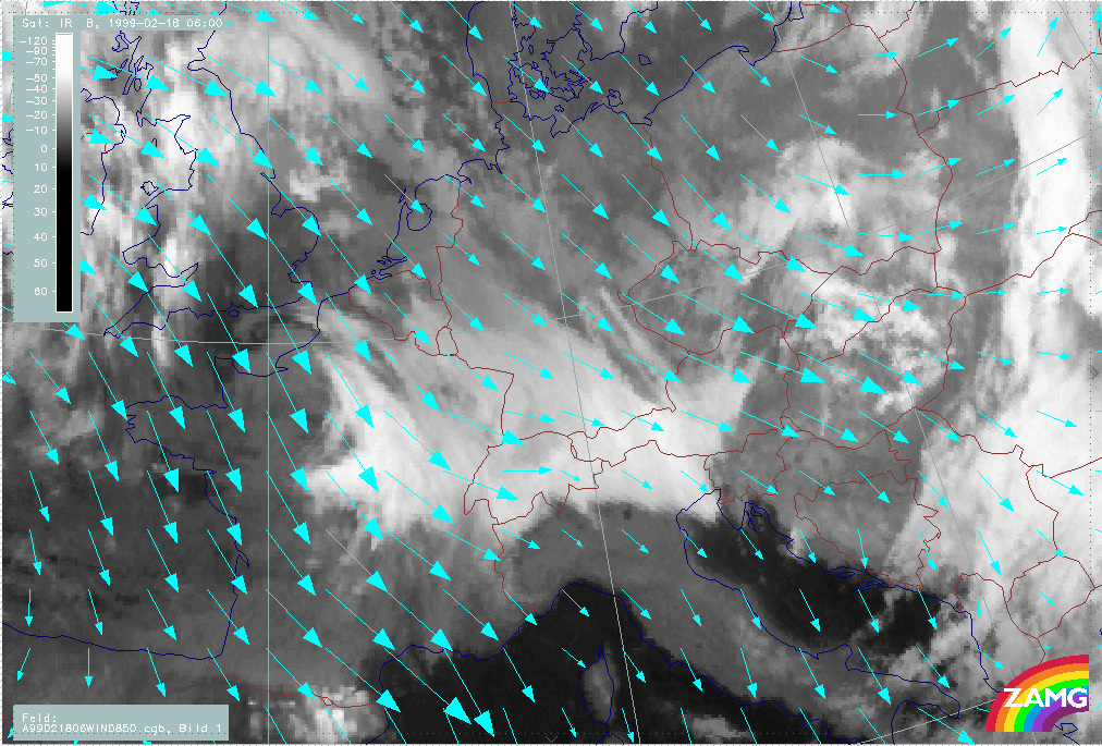 18 February 1999/06.00 UTC - Meteosat IR image; cyan: wind vectors 850 hPa