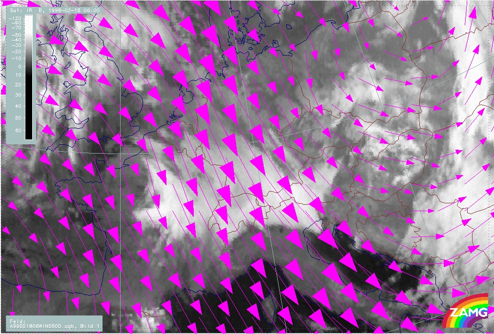 18 February 1999/06.00 UTC - Meteosat IR image; magenta: wind vectors 500 hPa