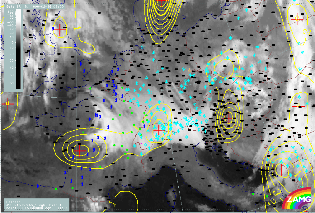 18 February 1999/06.00 UTC - Meteosat IR image; yellow: positive vorticity advection (PVA) 500 hPa; weather events (green: rain and showers, blue: drizzle, cyan: snow, red: thunderstorm