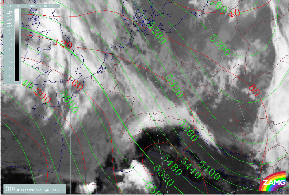 18 February 1999/12.00 UTC - Meteosat IR image; red: height contours 1000 hPa, green: height contours 500 hPa