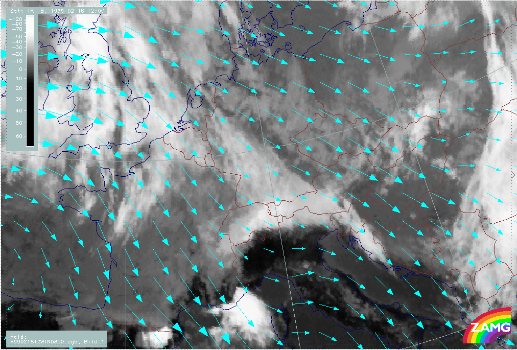 18 February 1999/12.00 UTC - Meteosat IR image; cyan: wind vectors 850 hPa