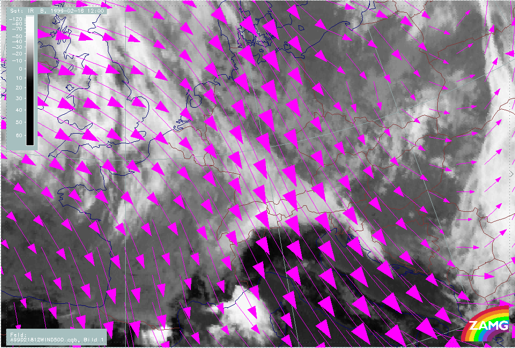 18 February 1999/12.00 UTC - Meteosat IR image; magenta: wind vectors 500 hPa