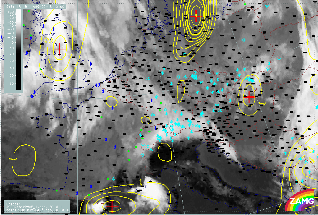18 February 1999/12.00 UTC - Meteosat IR image; yellow: positive vorticity advection (PVA) 500 hPa; weather events (green: rain and showers, blue: drizzle, cyan: snow, red: thunderstorm