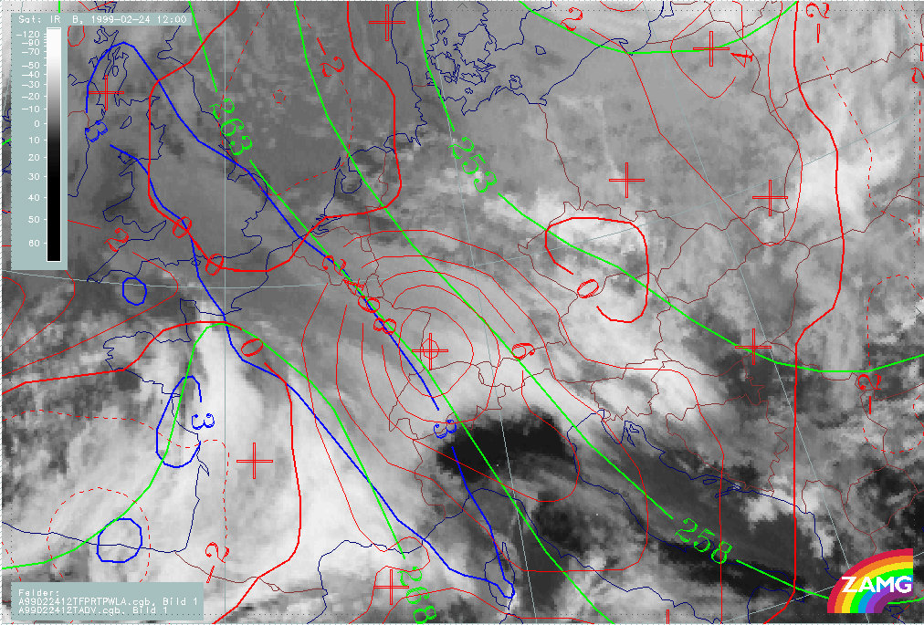 24 February 1999/12.00 UTC - Meteosat IR image; green: equivalent thickness 500/1000 hPa, red solid: temperature advection - WA 700 hPa, red dashed: temperature advection - CA 700 hPa,