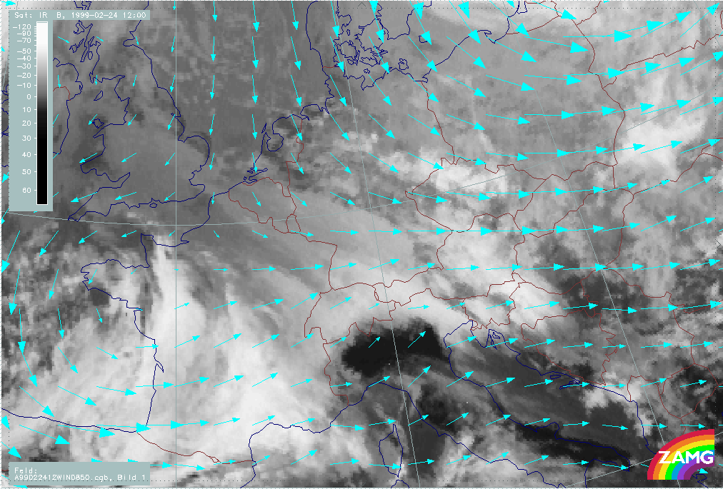 24 February 1999/12.00 UTC - Meteosat IR image; cyan: wind vectors 850 hPa