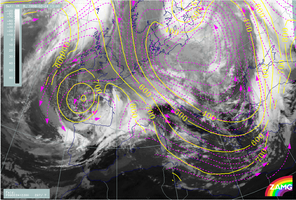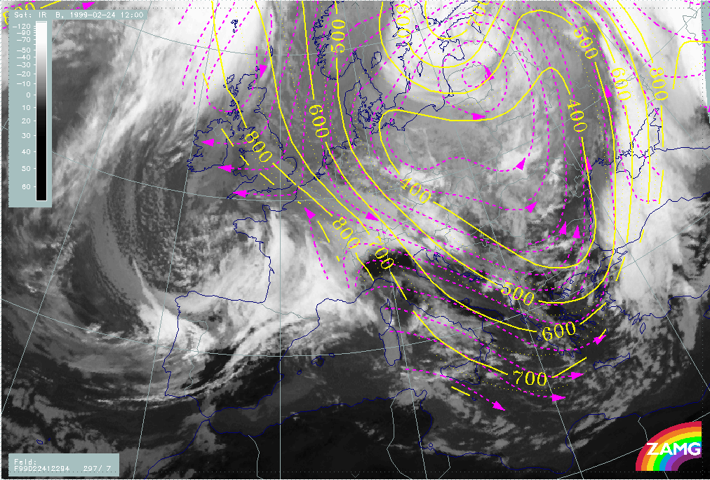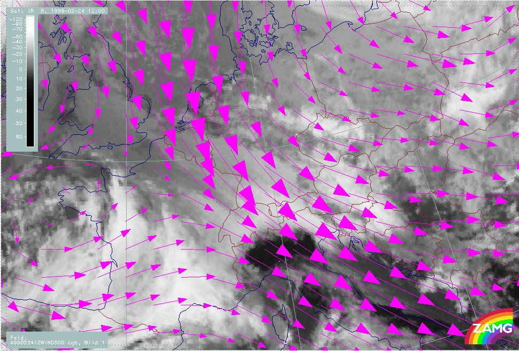 24 February 1999/12.00 UTC - Meteosat IR image; magenta: wind vectors 500 hPa