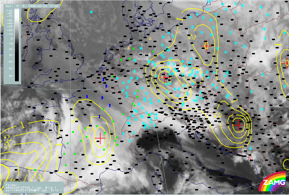24 February 1999/12.00 UTC - Meteosat IR image; yellow: positive vorticity advection (PVA) 500 hPa; weather events (green: rain and showers, blue: drizzle, cyan: snow, red: thunderstorm