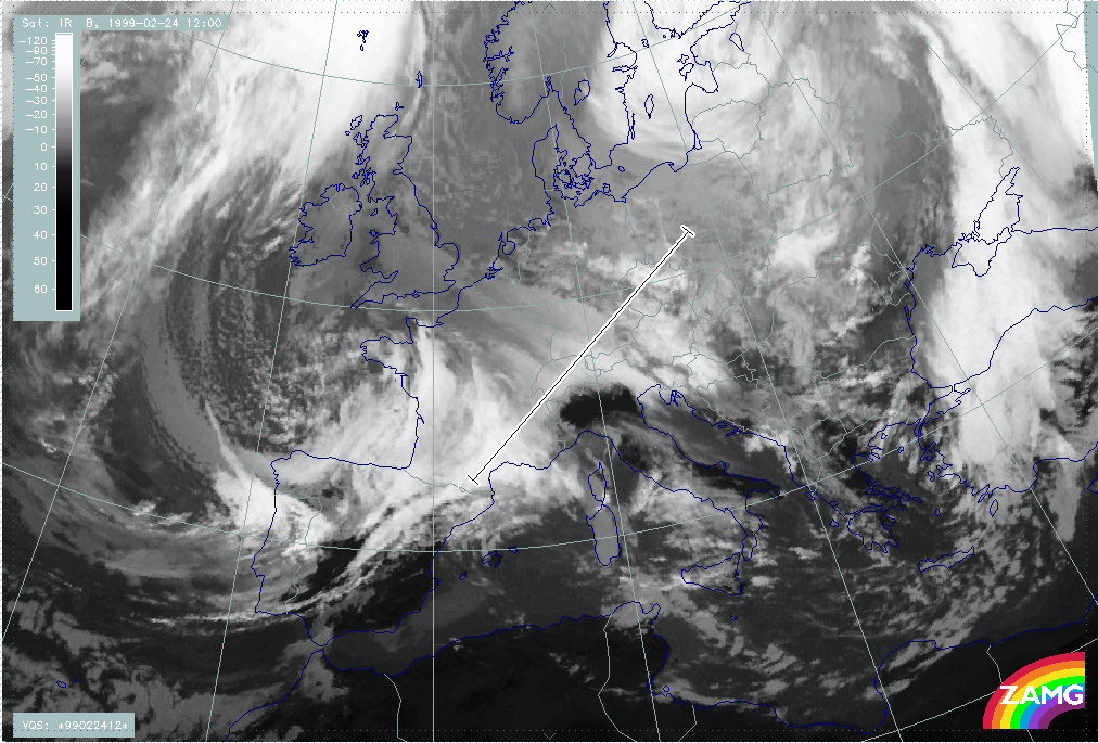 24 February 1999/12.00 UTC - Meteosat IR image; position of vertical cross section indicated