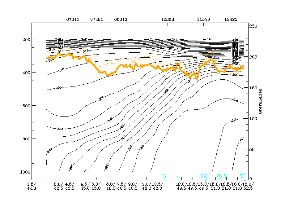 24 February 1999/12.00 UTC - Vertical cross section; black: isentropes (ThetaE), orange thin: IR pixel values, orange thick: WV pixel values