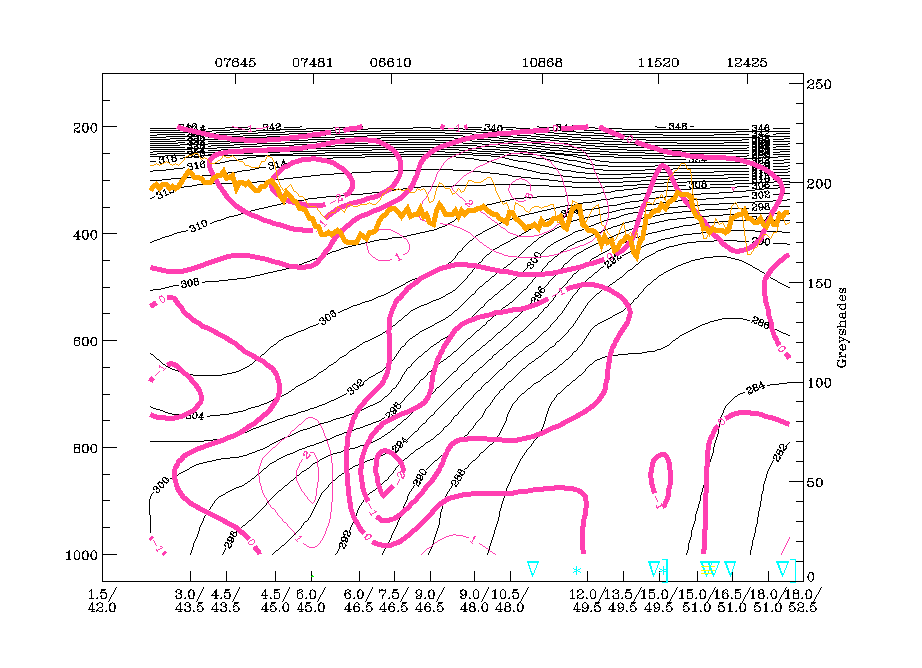 24 February 1999/12.00 UTC - Vertical cross section; black: isentropes (ThetaE), magenta thin: divergence, magenta thick: convergence, orange thin: IR pixel values, orange thick: WV