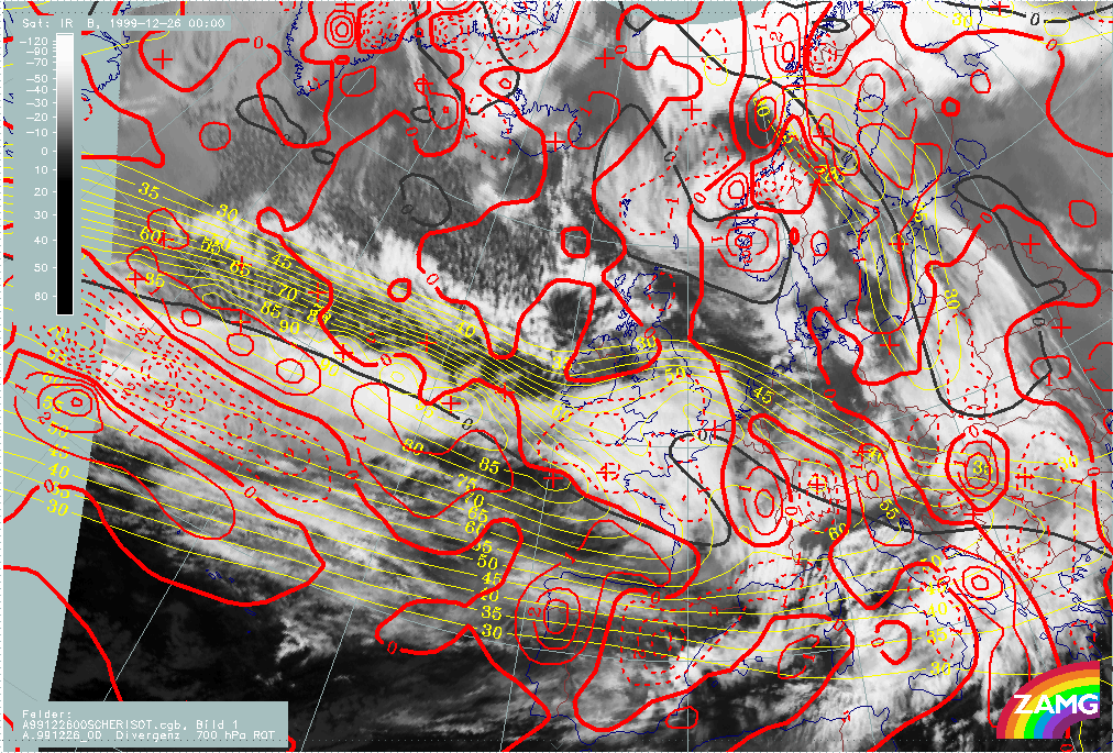 26 December 1999/00.00 UTC - Meteosat IR image; yellow: isotachs 300 hPa, black: shear vorticity 300 hPa, red dashed: divergence 700 hPa, red solid: convergence 700 hPa