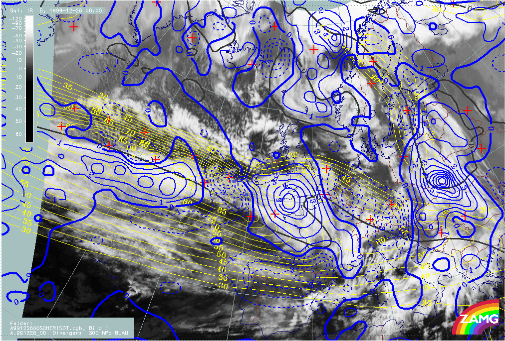 26 December 1999/00.00 UTC - Meteosat IR image; yellow: isotachs 300 hPa, black: shear vorticity 300 hPa, blue dashed: divergence 300 hPa, blue solid: convergence 300 hPa