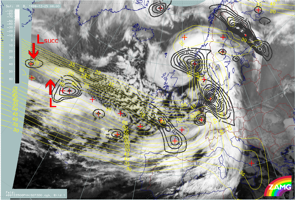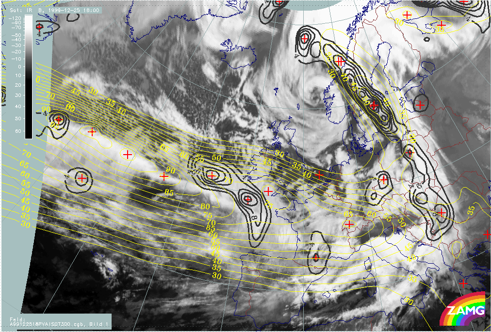 25 December 1999/06.00 UTC - Meteosat IR image; yellow: isotachs 300 hPa, black: positive vorticity advection (PVA) 300 hPa; 25/06.00 - 26/12.00 UTC 6-hourly image loop