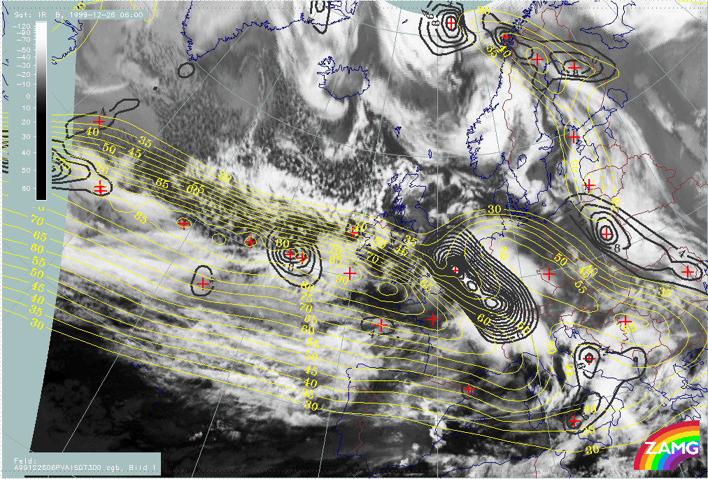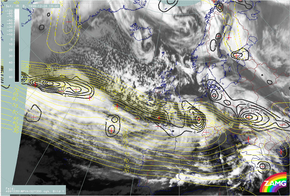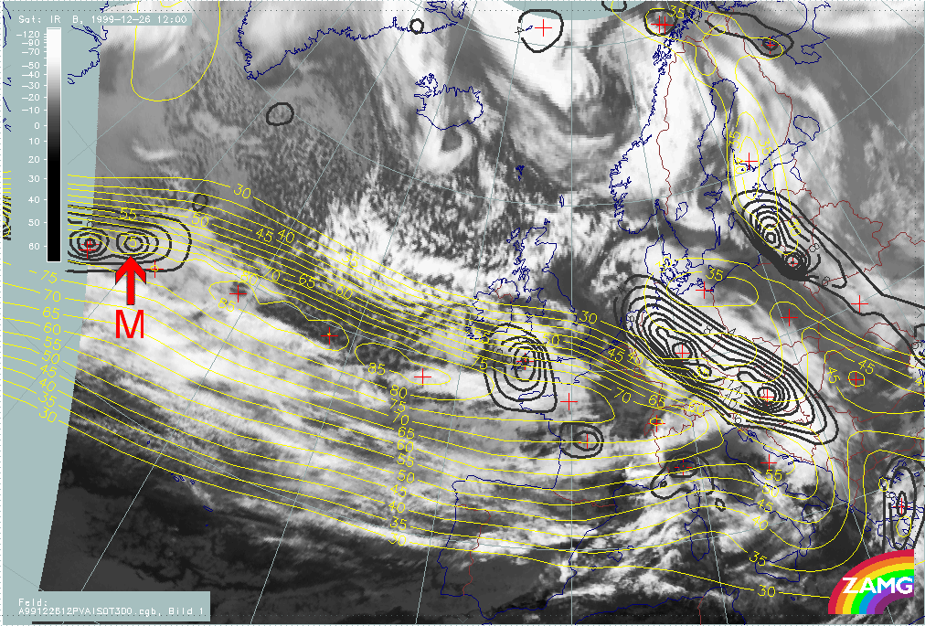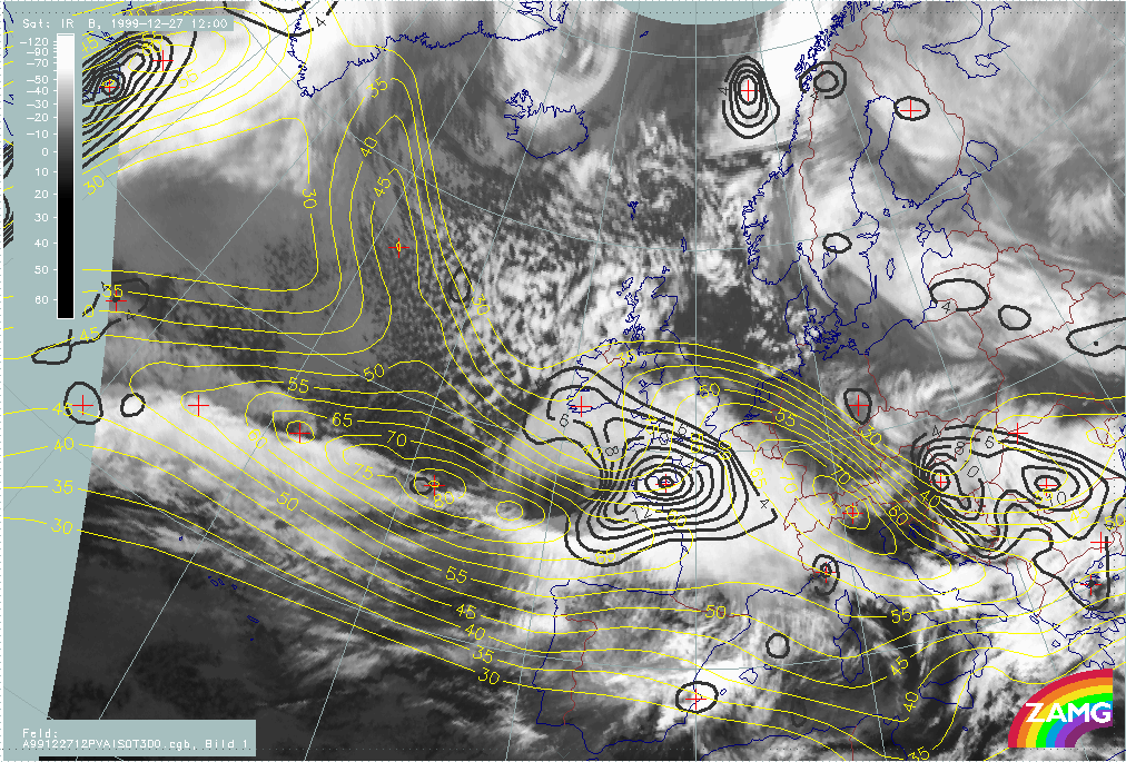 26 December 1999/12.00 UTC - Meteosat IR image; yellow: isotachs 300 hPa, black: positive vorticity advection (PVA) 300 hPa; 26/12.00 - 27/18.00 UTC 6-hourly image loop