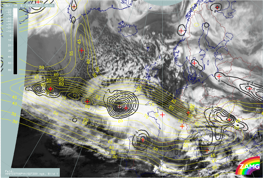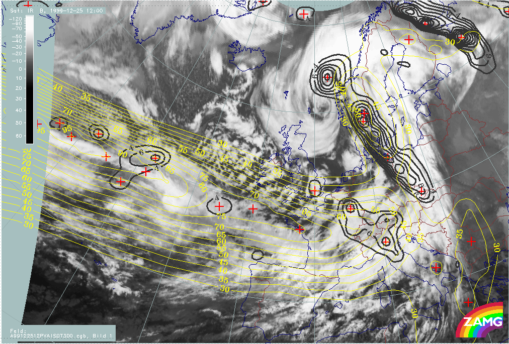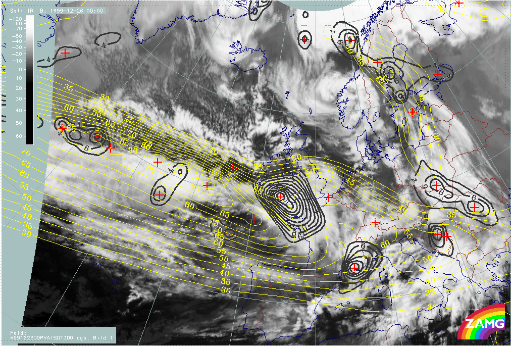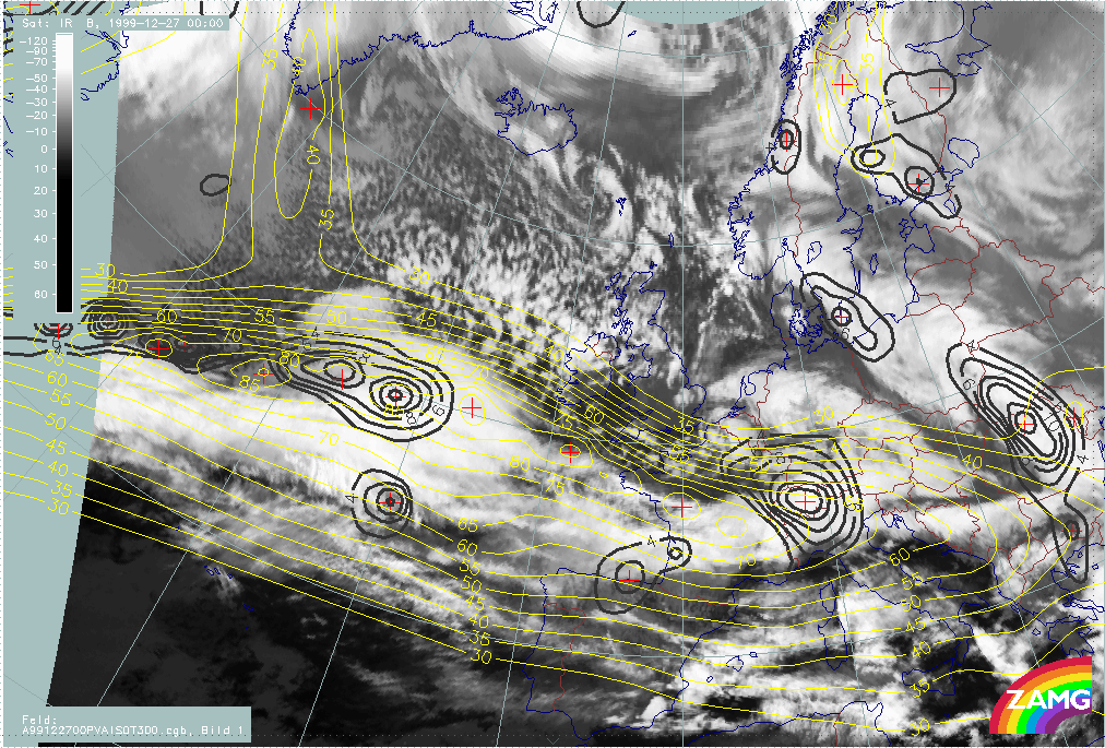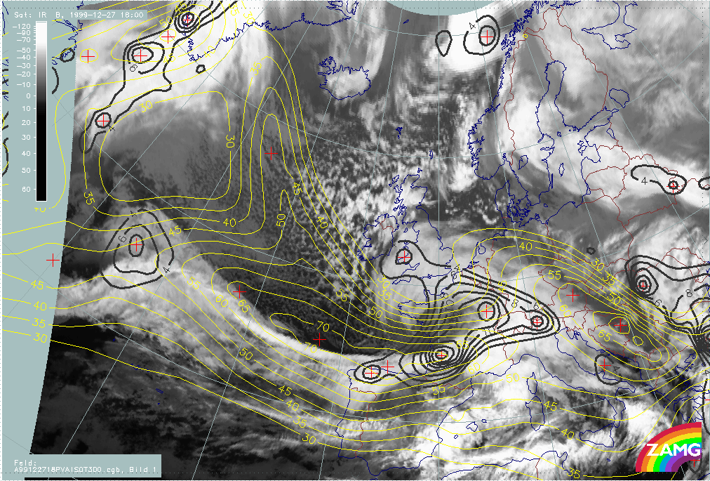 26 December 1999/12.00 UTC - Meteosat IR image; yellow: isotachs 300 hPa, black: positive vorticity advection (PVA) 300 hPa; 26/12.00 - 27/18.00 UTC 6-hourly image loop