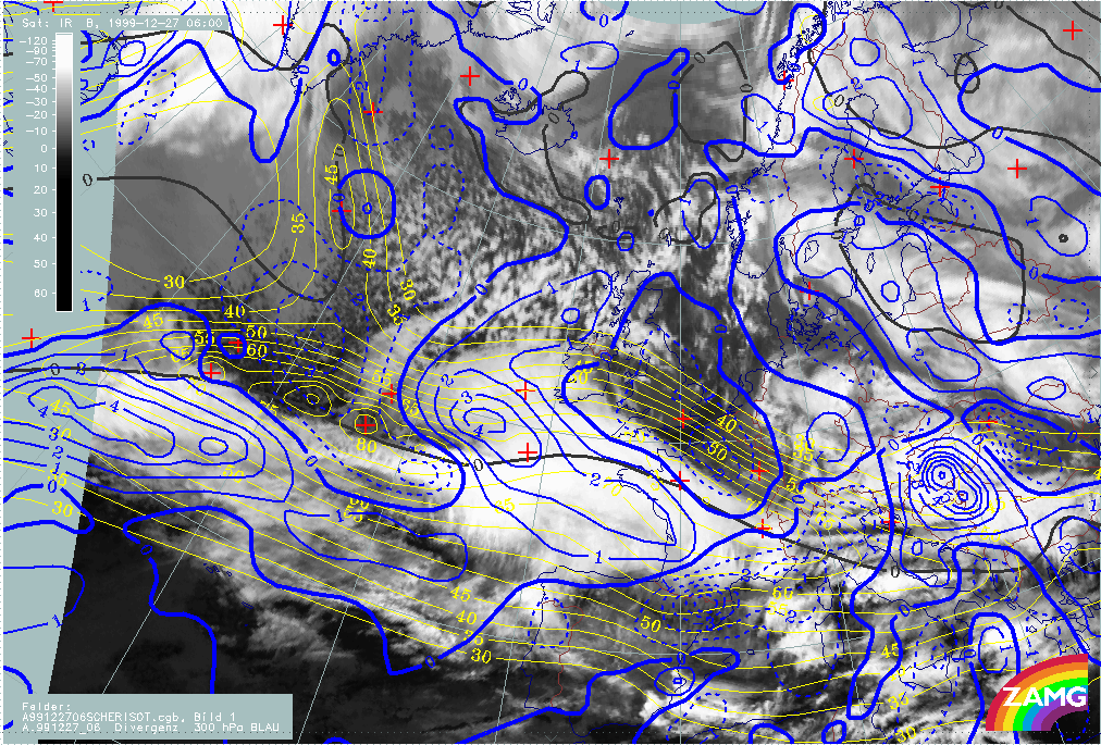 27 December 1999/06.00 - Meteosat IR image; yellow: isotachs 300 hPa, black: shear vorticity 300 hPa, blue dashed: divergence 300 hPa, blue solid: convergence 300 hPa