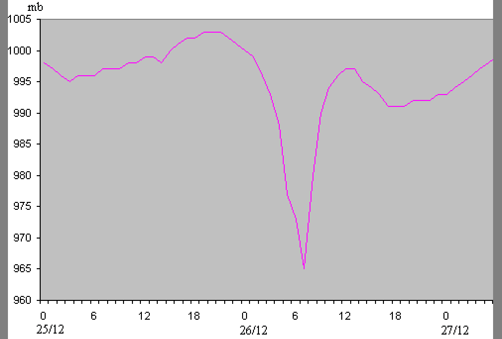 The drop in surface pressure was dramatic (see diagram above), falls of more than 10 hPa/hour were measured over NW France and the rise in pressure immediately following the passage of the low was approximately the same.
