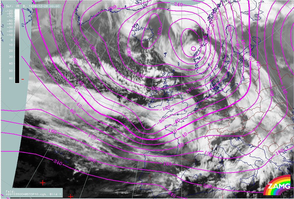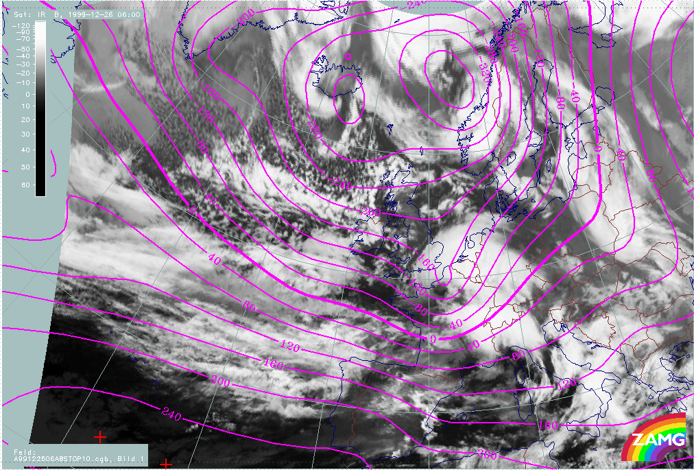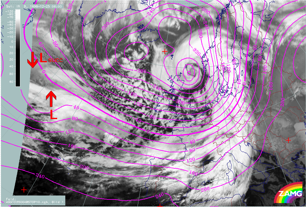 A loop showing changes in surface height at 1000 hPa, from 25 December/06.00 UTC to 26 December/12.00 UTC, shows: the deepening of the surface low corresponding to Lothar, a weak and not intensifiying surface trough corresponding to Lothar successor and the relationship between the surface lows and typical cloud features.