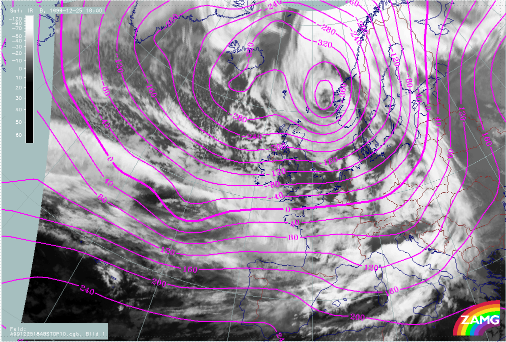 25 December 1999/06.00 UTC - Meteosat IR image; magenta: height contours 1000 hPa; 25/06.00 - 26/12.00 UTC 6-hourly image loop