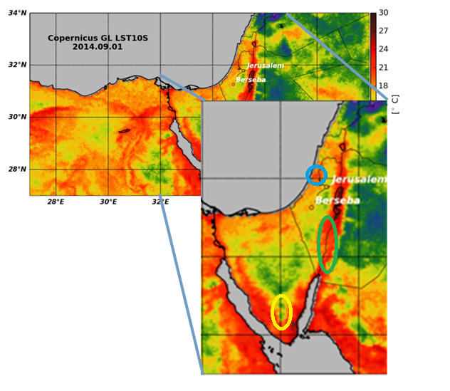 Consider the following image showing the minimum LST observed for a 10 days period (from 1 to 11 September 2014) (Copernicus Global Land LST product) over Israel and the Sinai Peninsula.