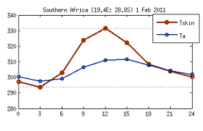 It is worth highlighting here that although radiometric and air temperature are different variables they are strongly correlated. However, they differ in phase and amplitude, as illustrated by fig. 2, which shows an example of a diurnal cycle over a given biome (savannah) for a particular date, taken from model data. It can be seen that the amplitude of Tskin is over 30 K (much higher than that of Tair) and peaks earlier than Tair due to the higher thermal capacity of the atmosphere (higher thermal inertia).